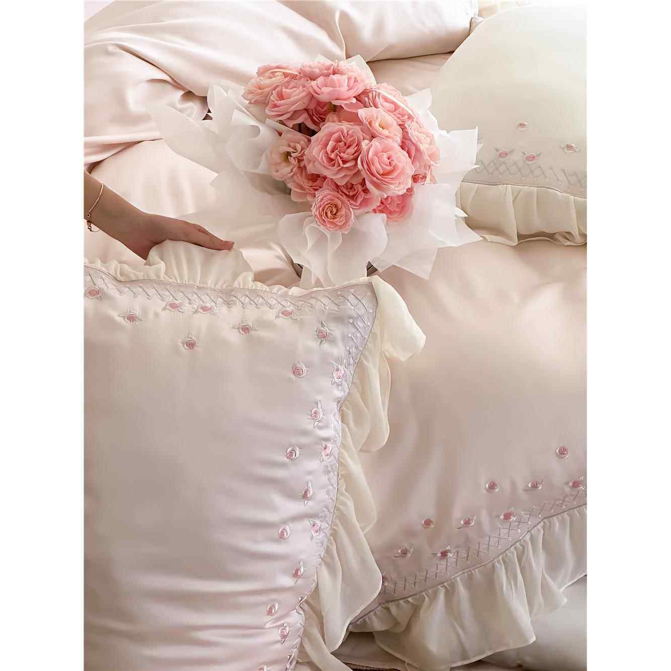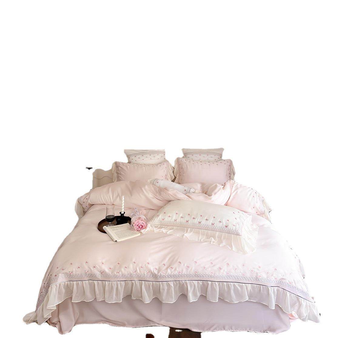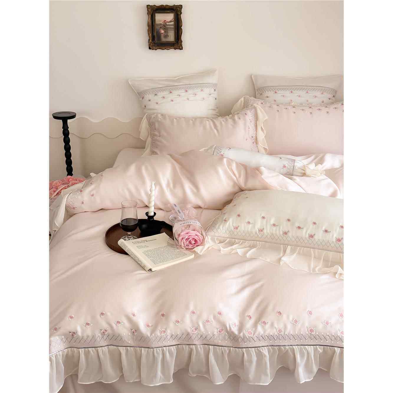 少女凉感100支天丝四件套优雅法式小玫瑰刺绣荷叶边被套春夏床品