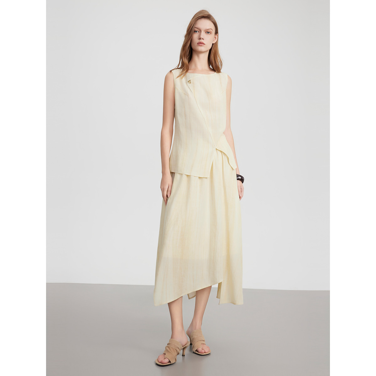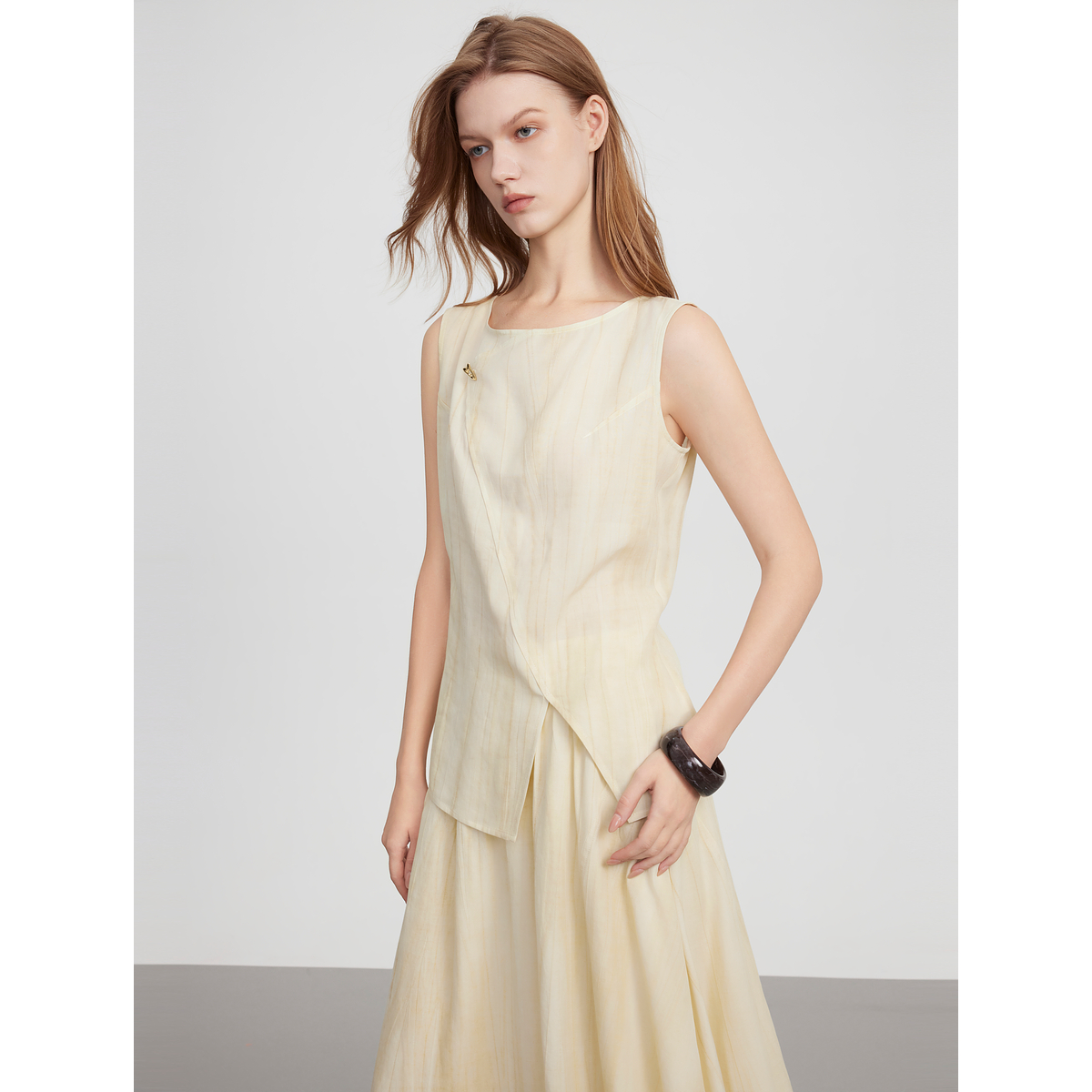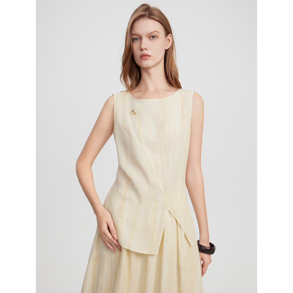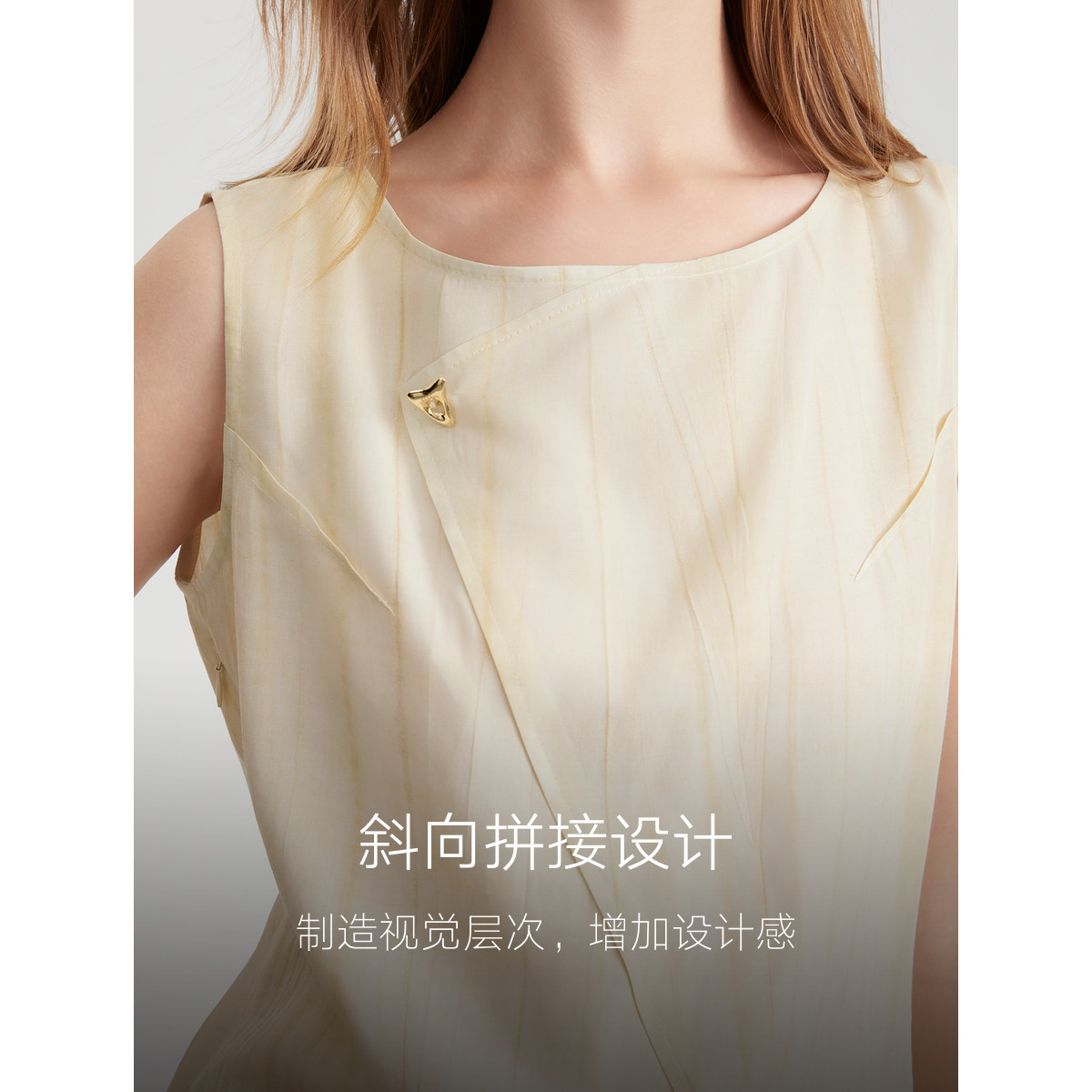 ELLE法式拼接亚麻无袖衬衫女2025夏季新款设计感优雅圆领天丝衬衣