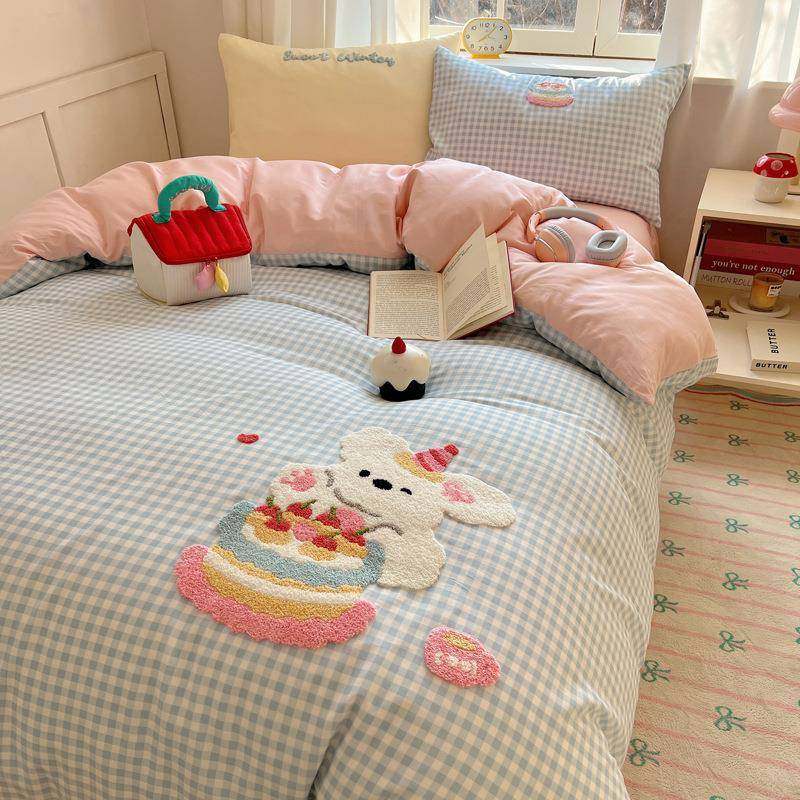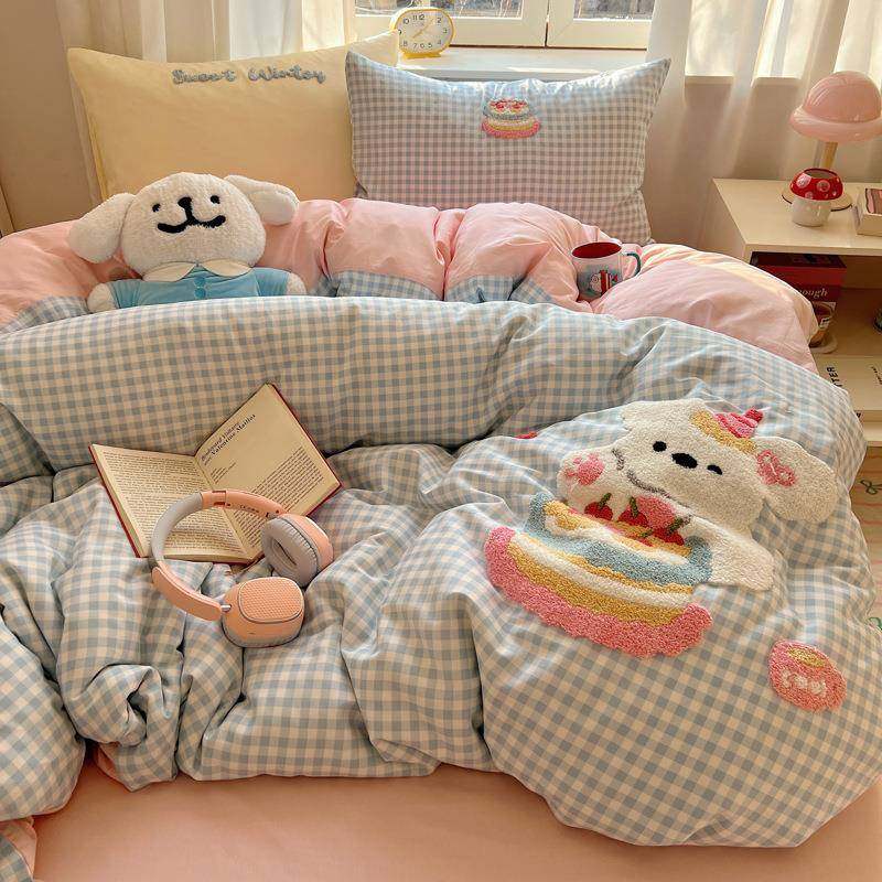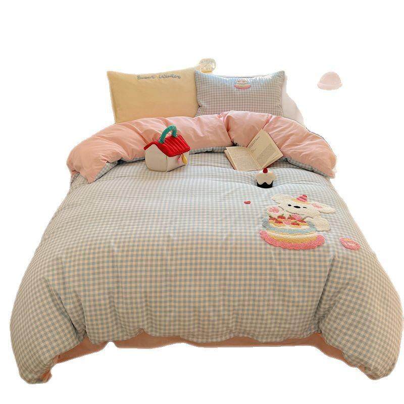 卡通可爱四件套纯棉毛巾绣被套被罩床单人学生宿舍三件套全棉床品