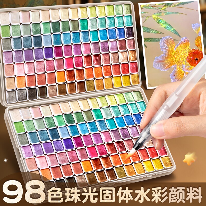 敦煌珠光水彩固体彩绘颜料画画工具套装美术生专用儿童小学生水粉美甲用98色分装盒国画爆闪珠光上色旅行套装