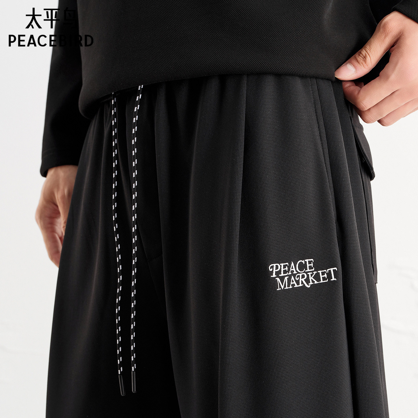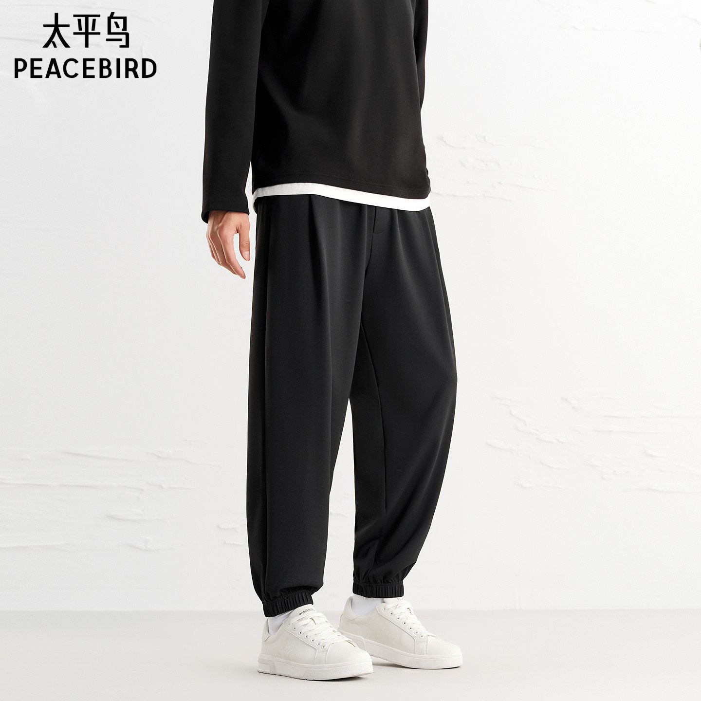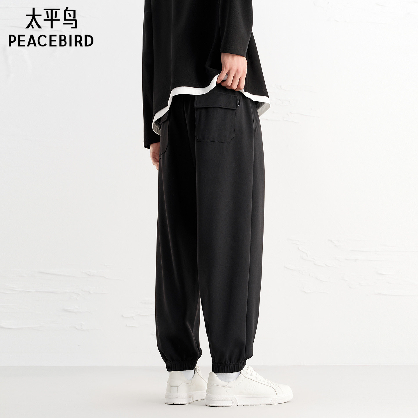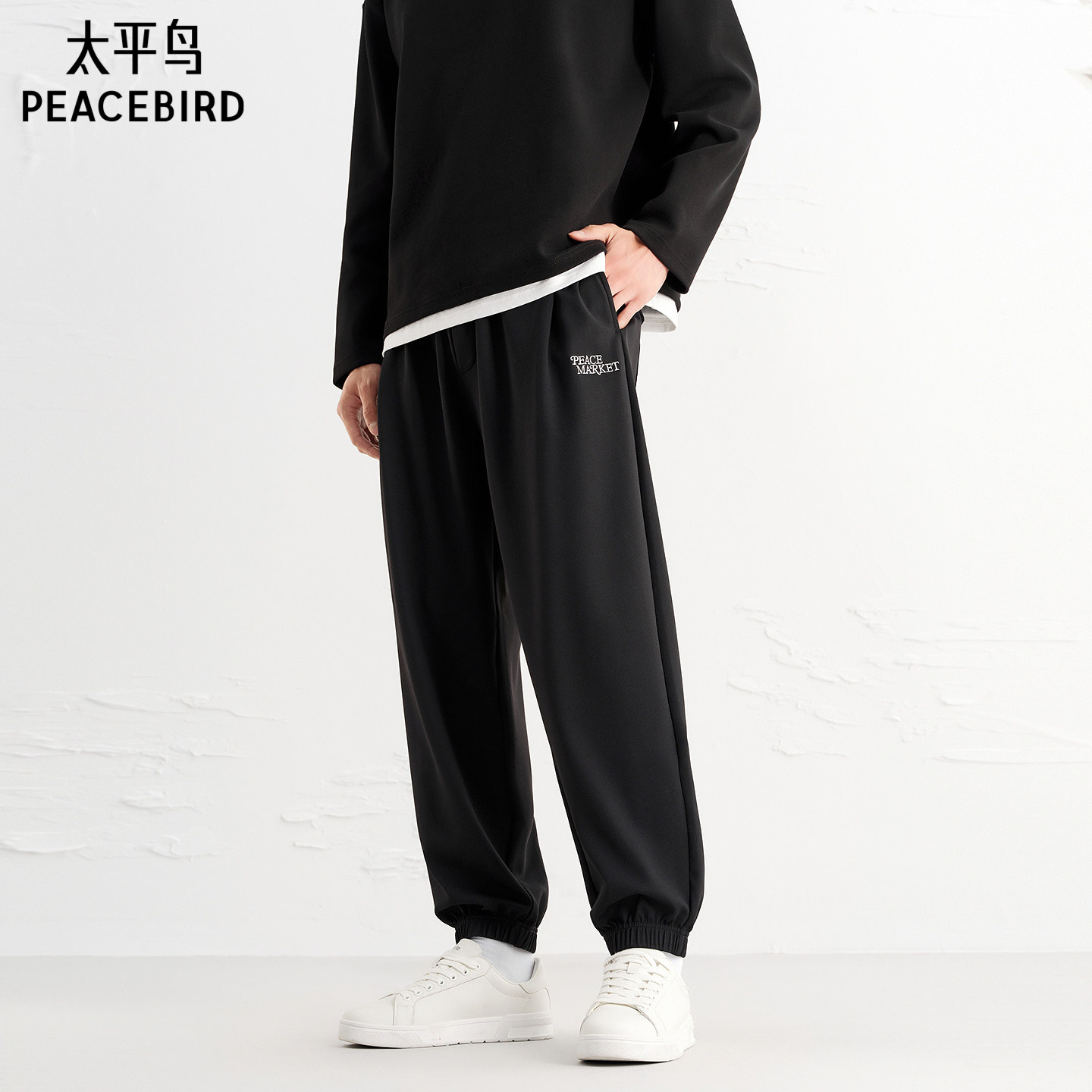 太平鸟男装 黑色肌理面料束脚裤男撞色刺绣抽绳锥形百搭休闲裤男