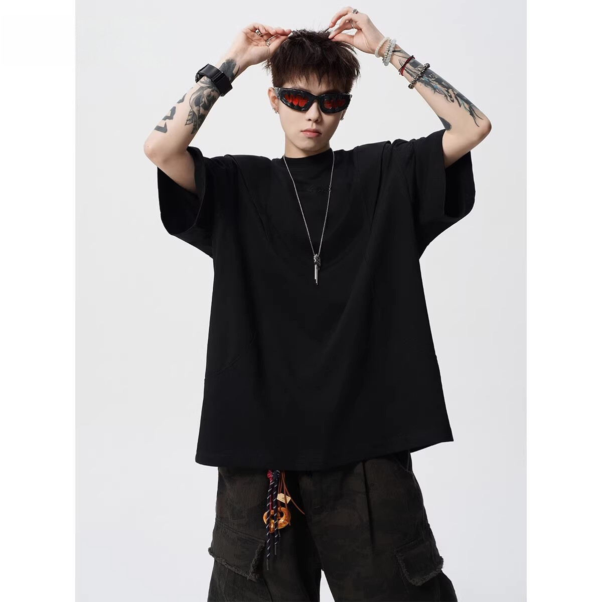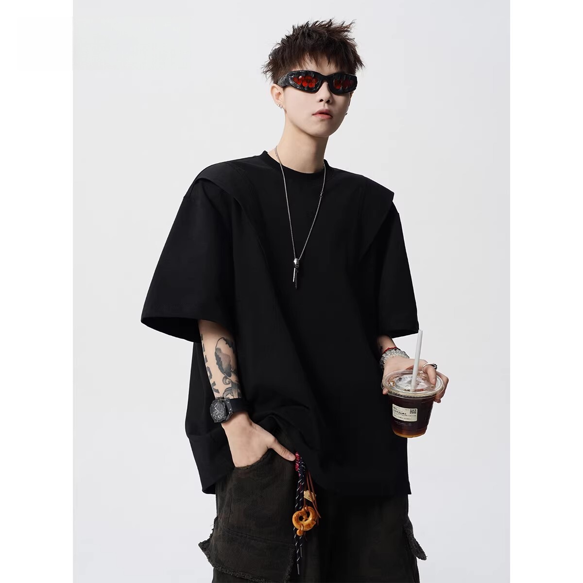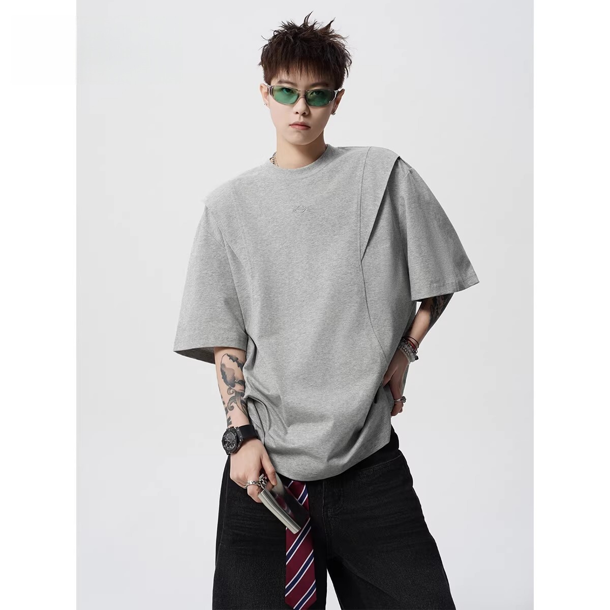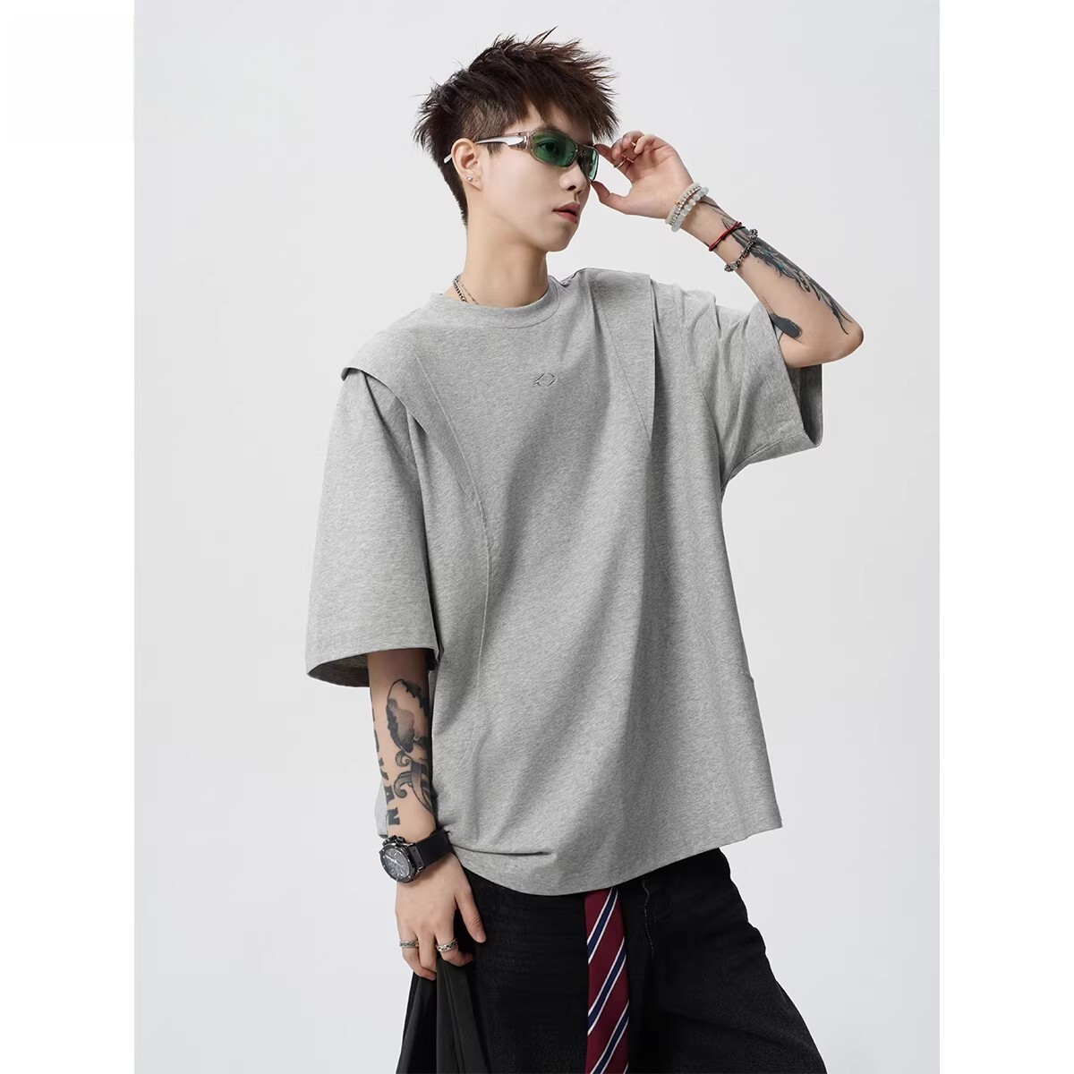 剪裁短袖T恤男女春夏美式高街解构套头衫设计感宽松体恤黑色灰色