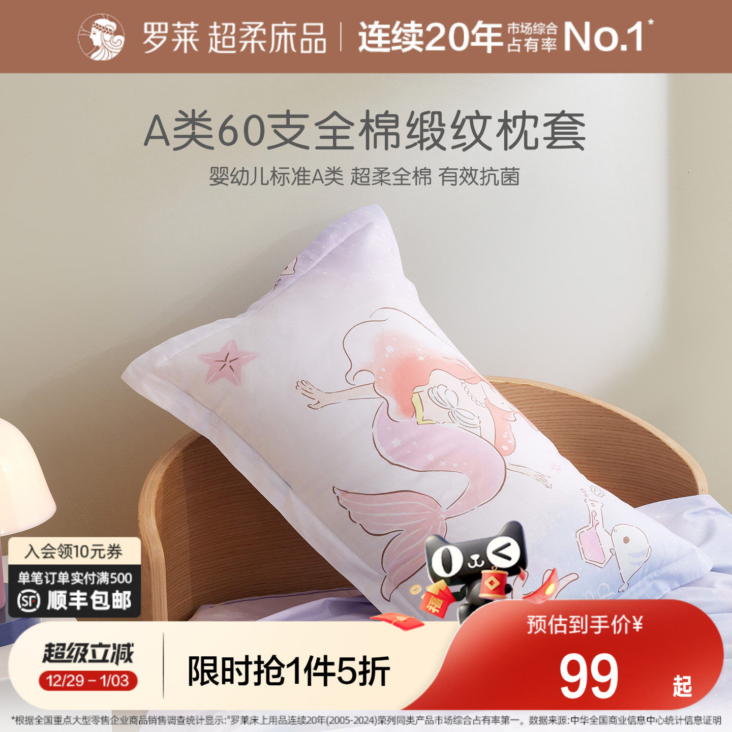 罗莱家纺儿童新款全棉纯棉单个枕套一对装女孩男生学生宿舍床品