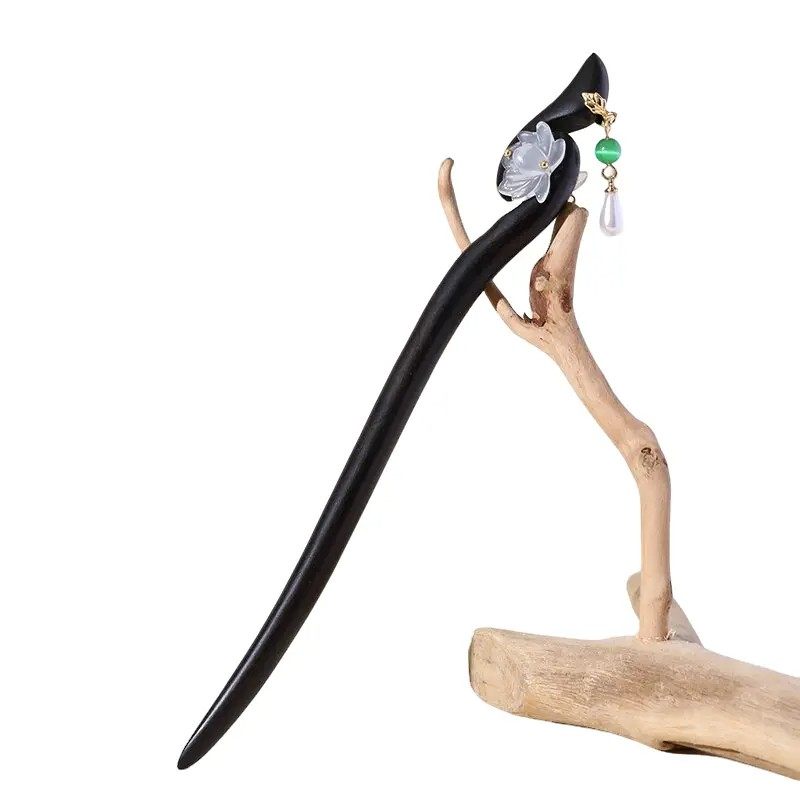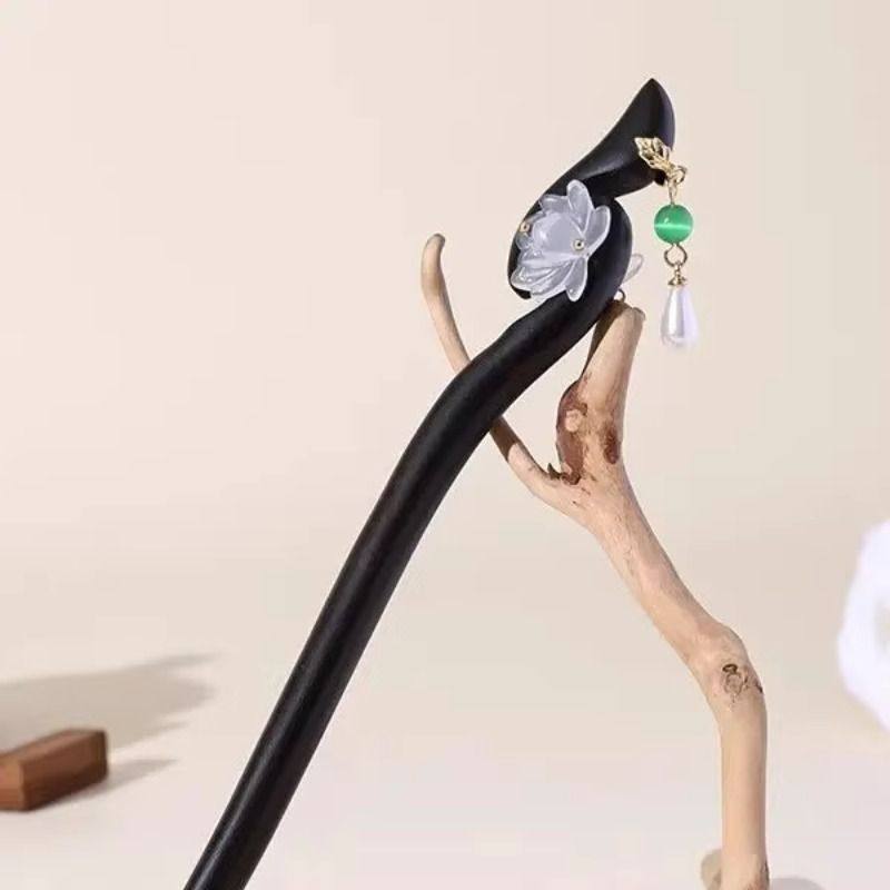 新中式莲花流苏发簪女高级感盘发簪子日常步摇发钗双面檀木金属