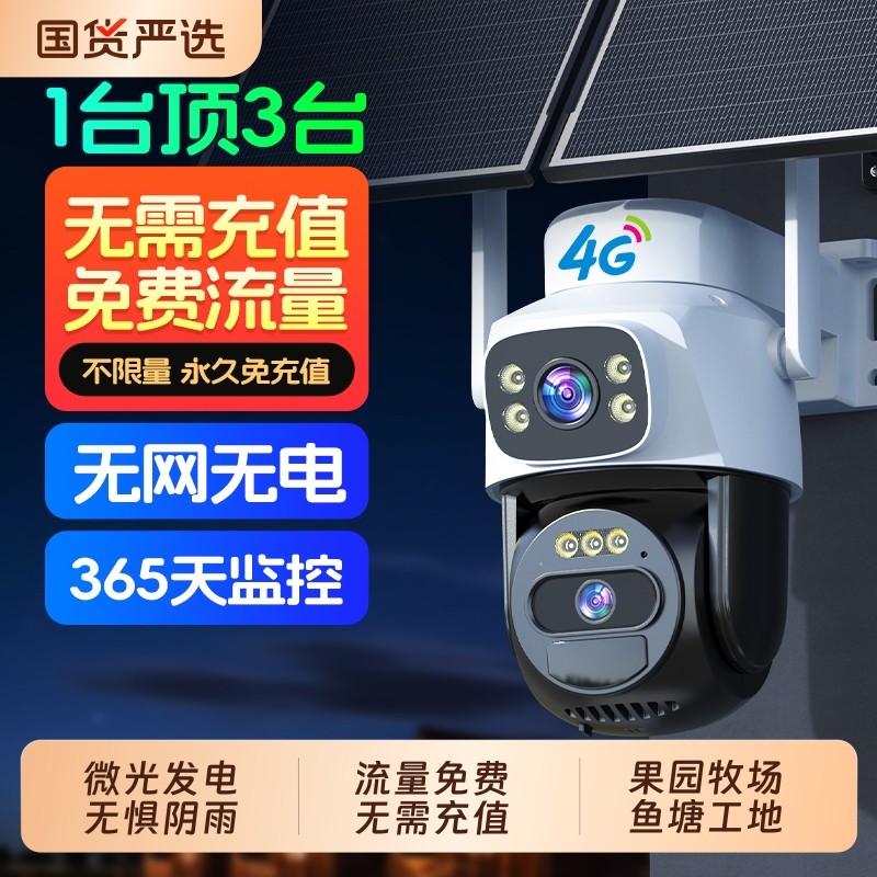太阳能监控摄像头360度无死角室外4G无电无网免流量无需网络摄影