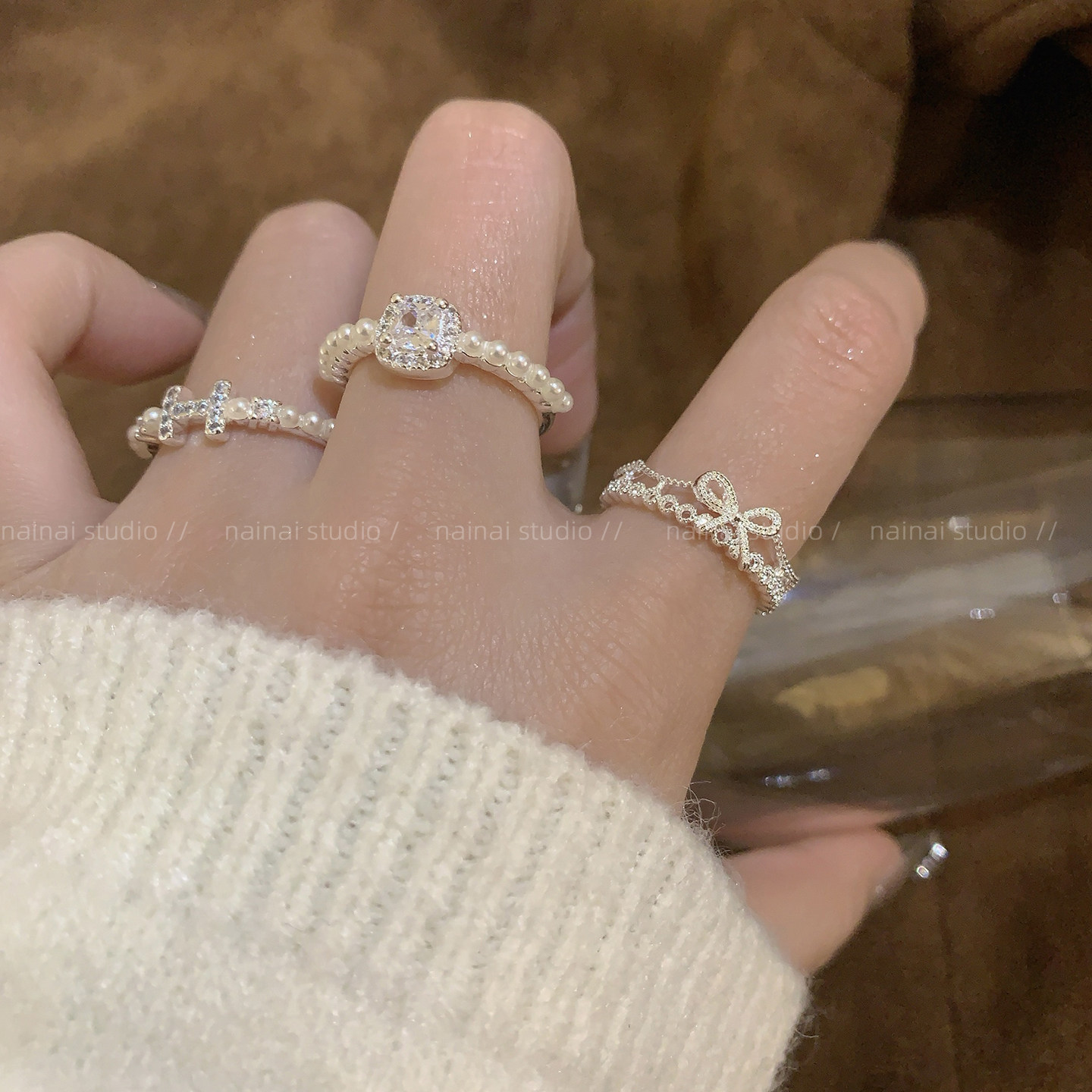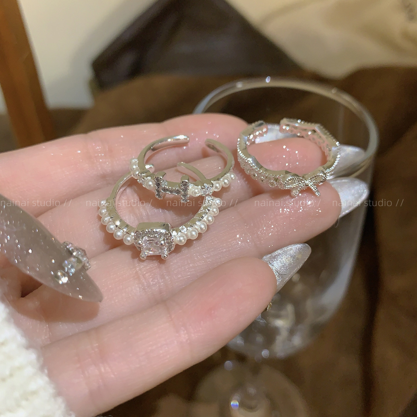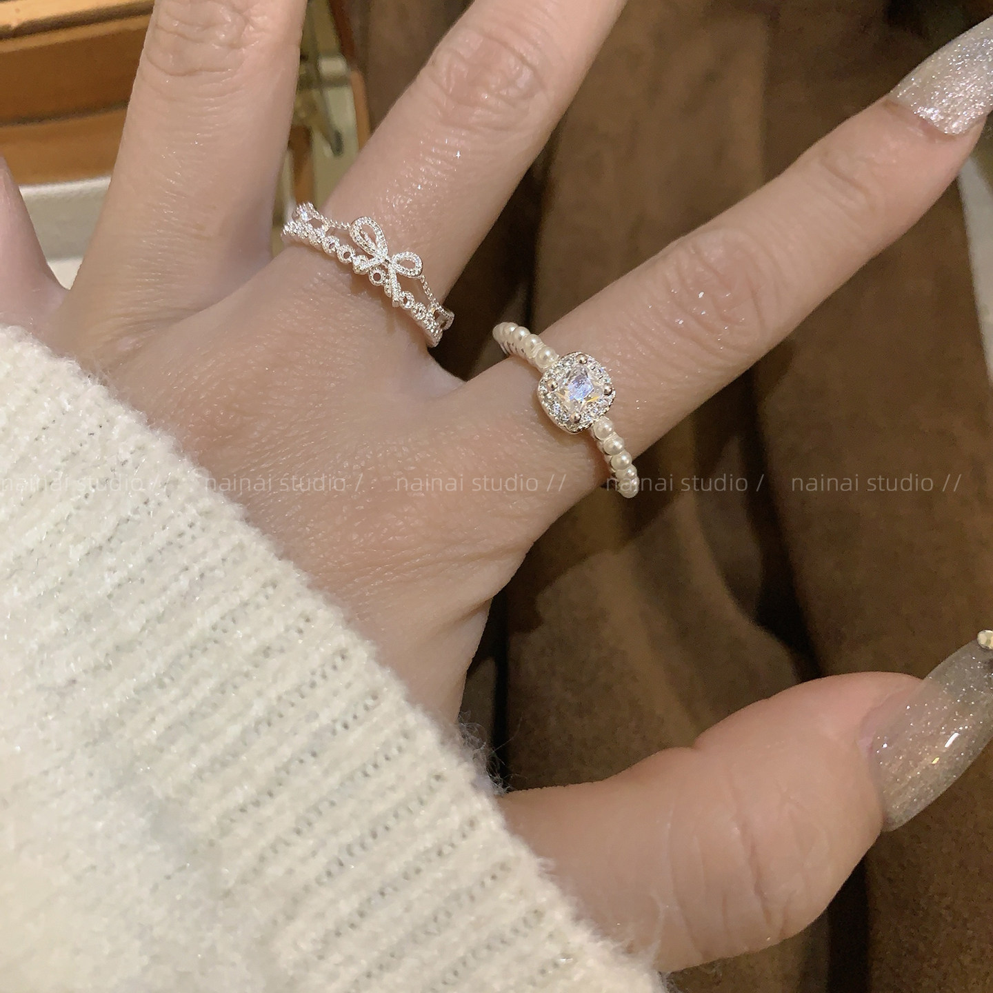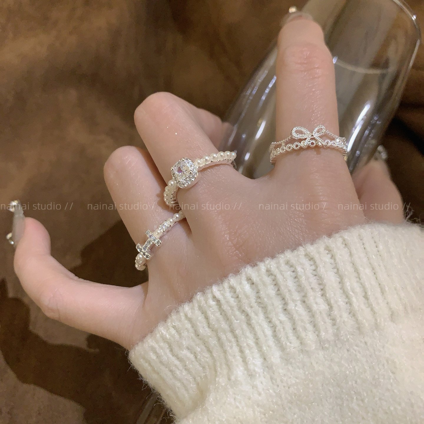 精致珍珠戒指~锆石超闪高级感轻奢H字母蝴蝶结食指戒开口指环女潮