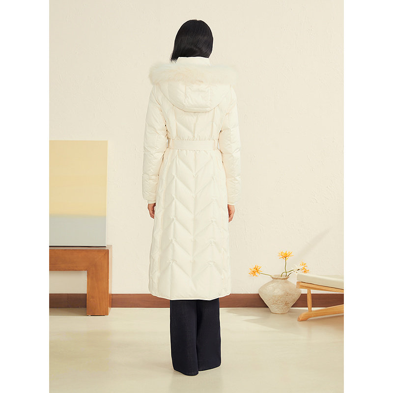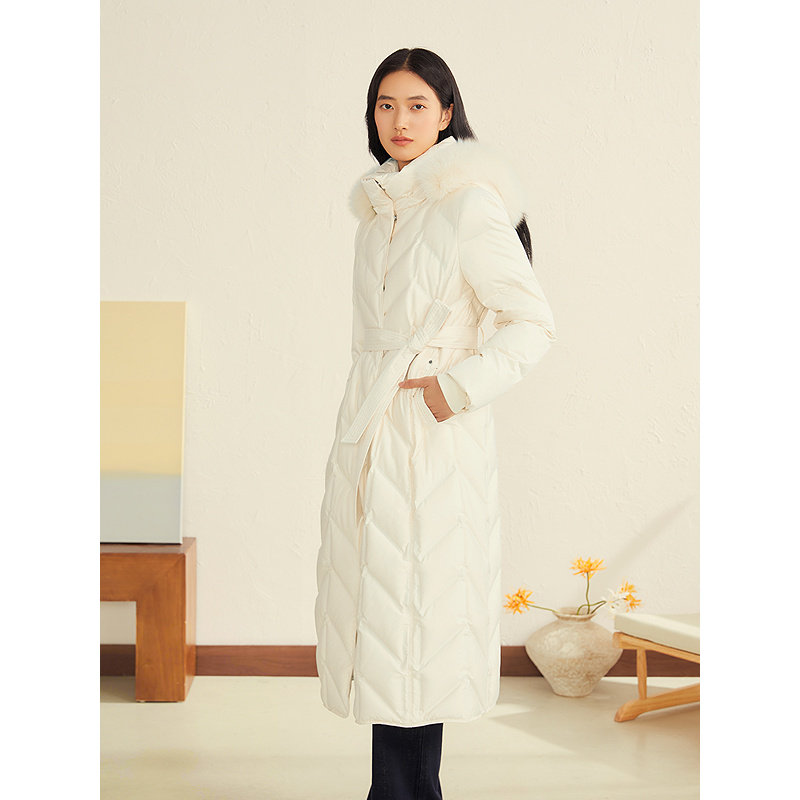 YINER音儿2025冬季新款桑蚕丝缎面可拆卸狐狸毛领连帽长款羽绒服