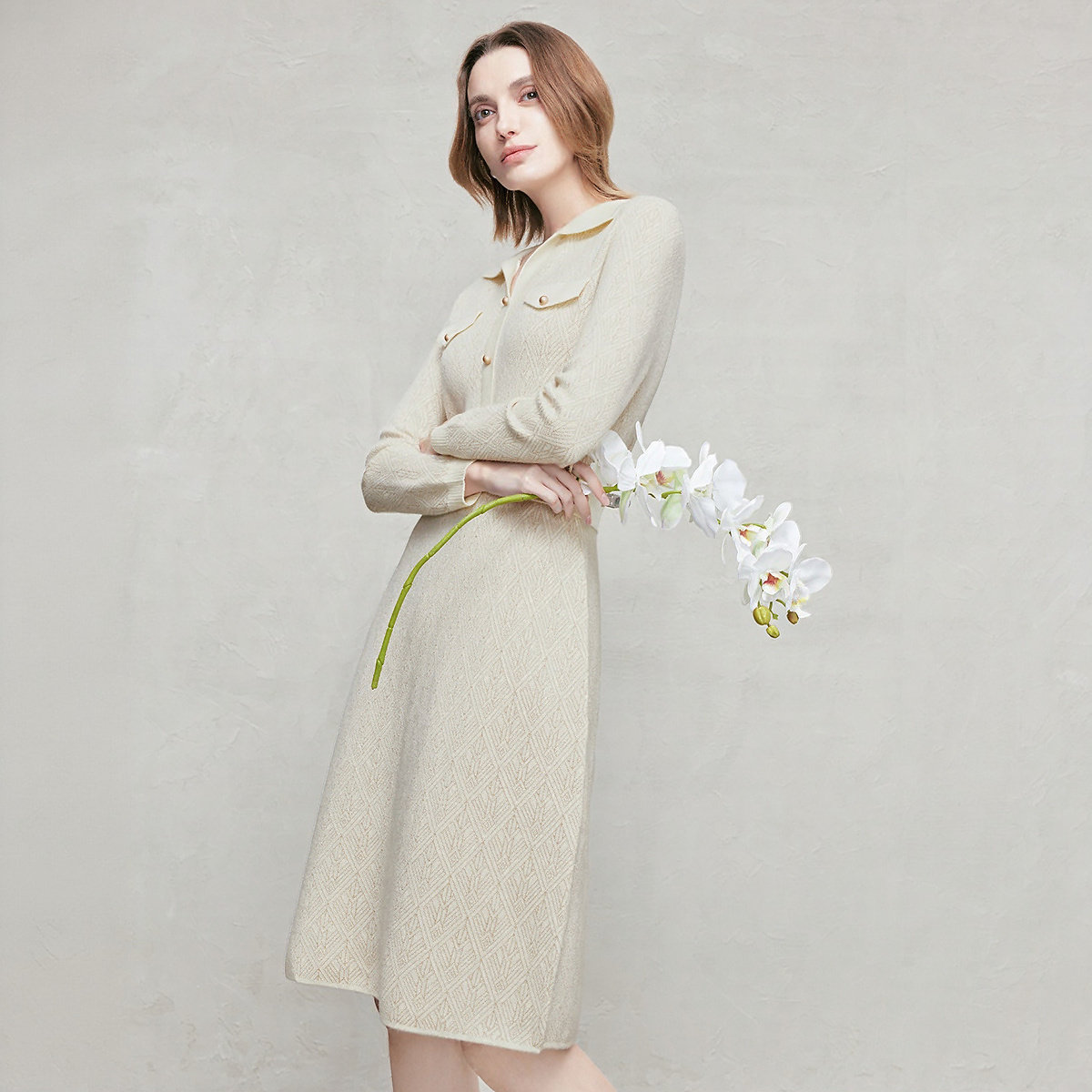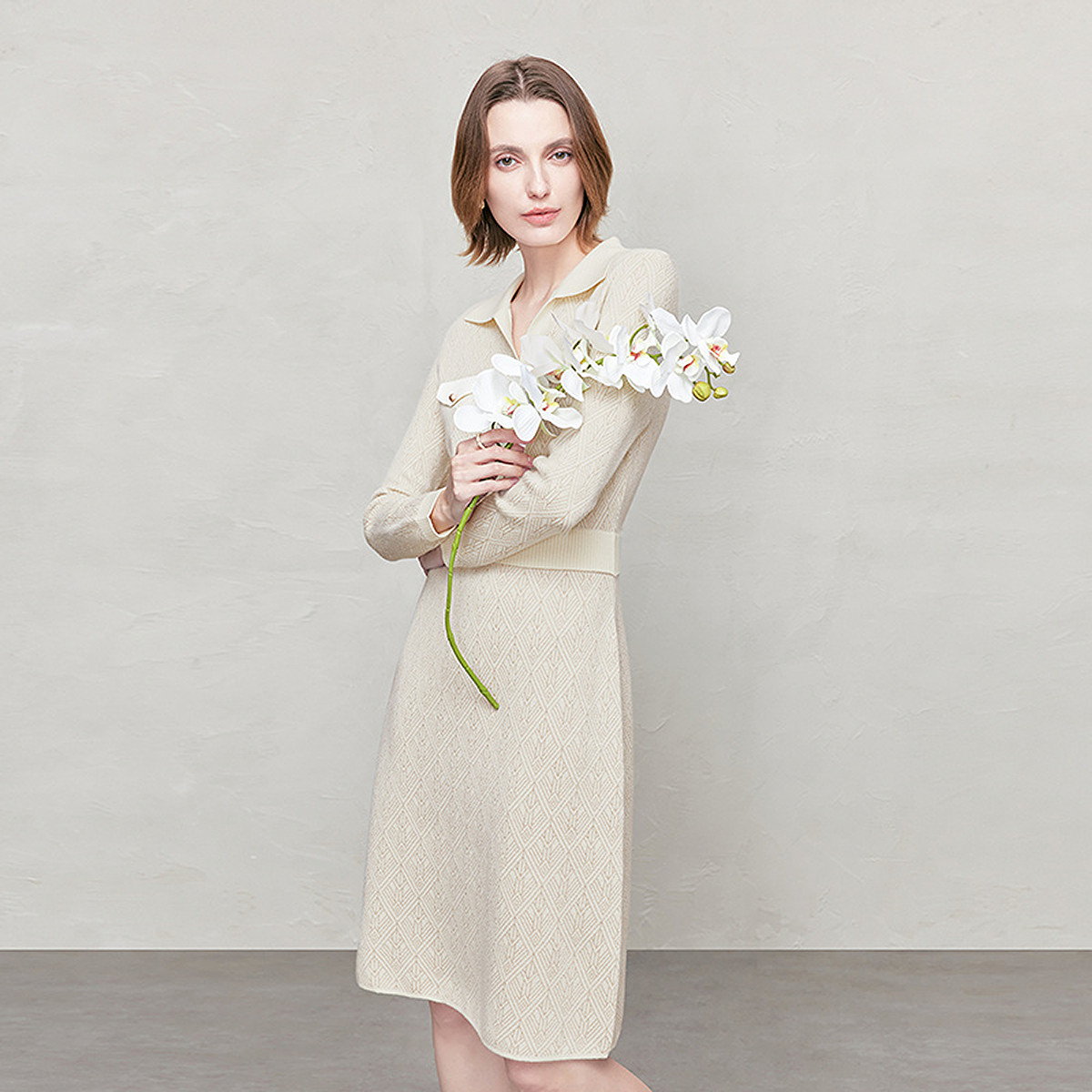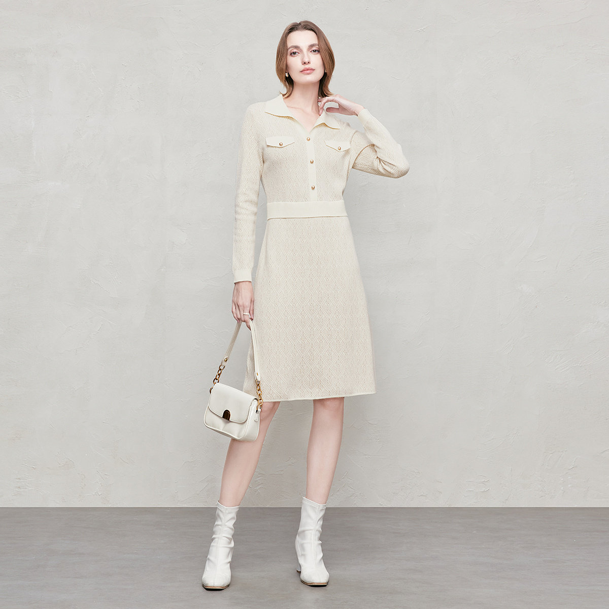 【商场同款】FINITY菲妮迪26年新款羊毛连衣裙简约米白提花长裙女