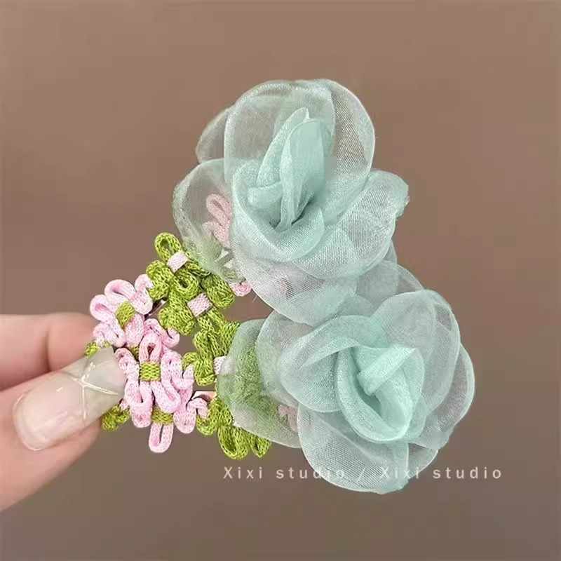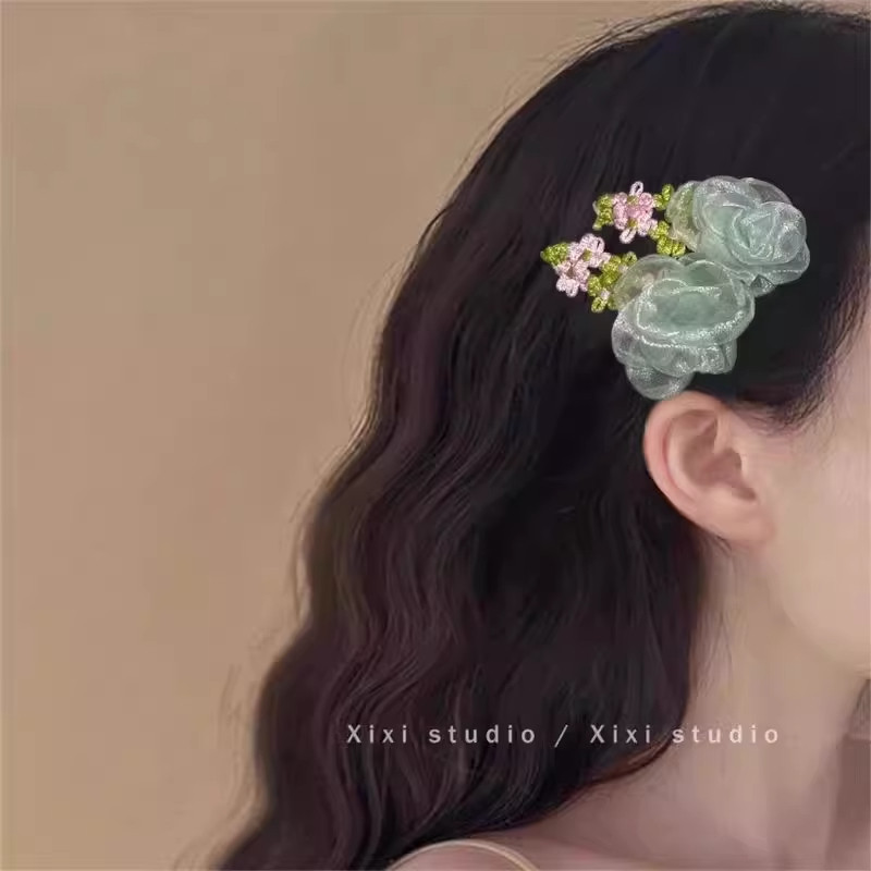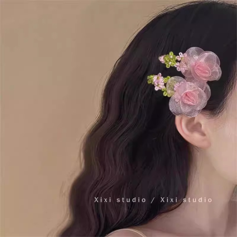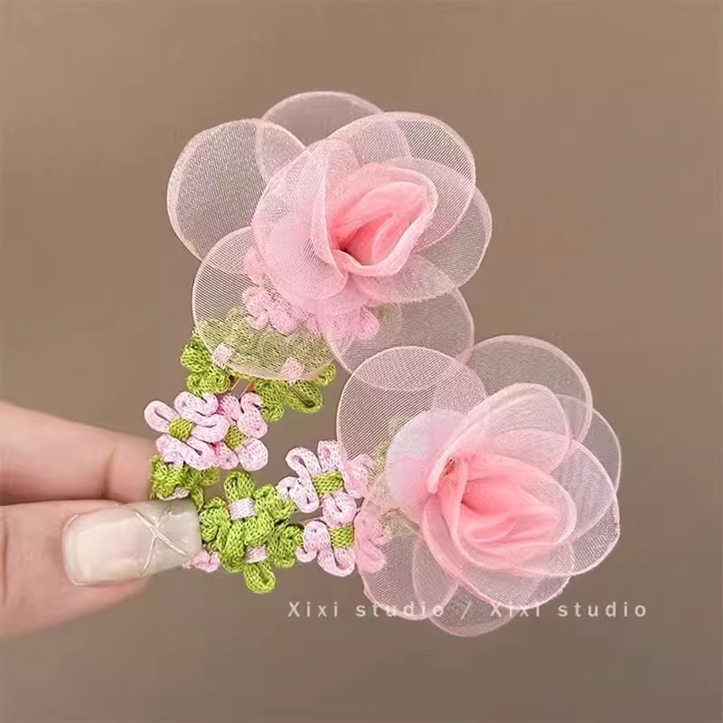 超仙网纱花朵发夹甜美粉色头花氛围感刘海夹侧边BB夹新款蓝色黑色