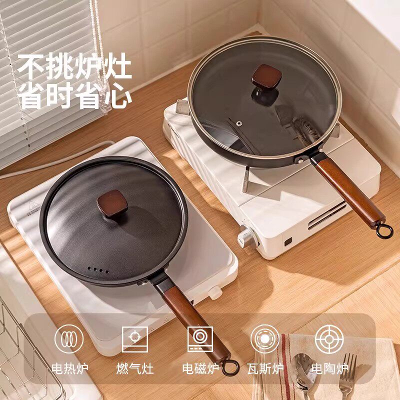 不锈钢胡桃木手柄平底锅宝宝辅食锅热油锅食品级多功能汤锅炒菜锅