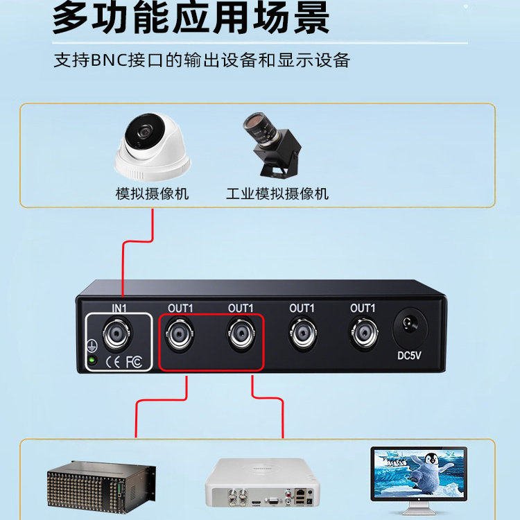 1进4出AHD/CVI/TVI视频分配器 海康高清同轴摄像头机信号一分二四