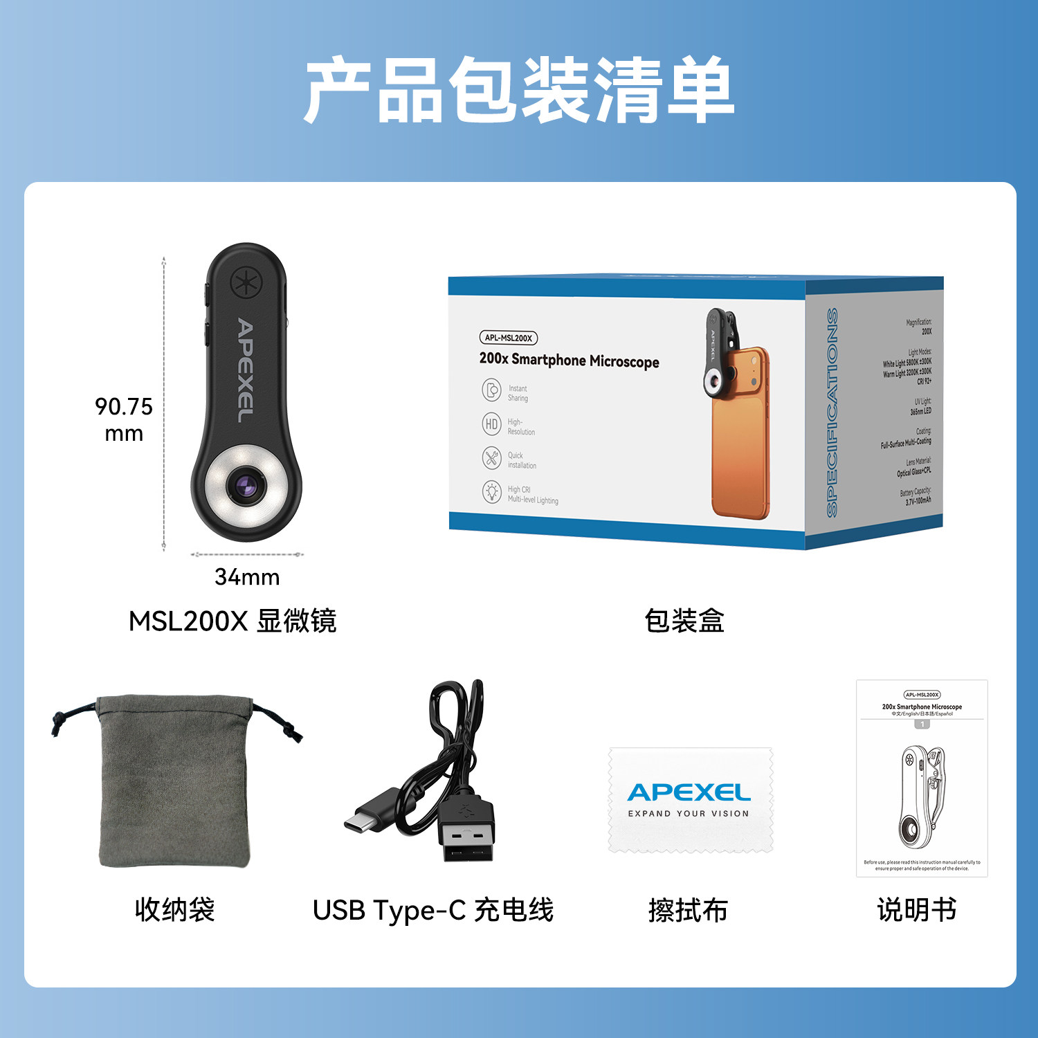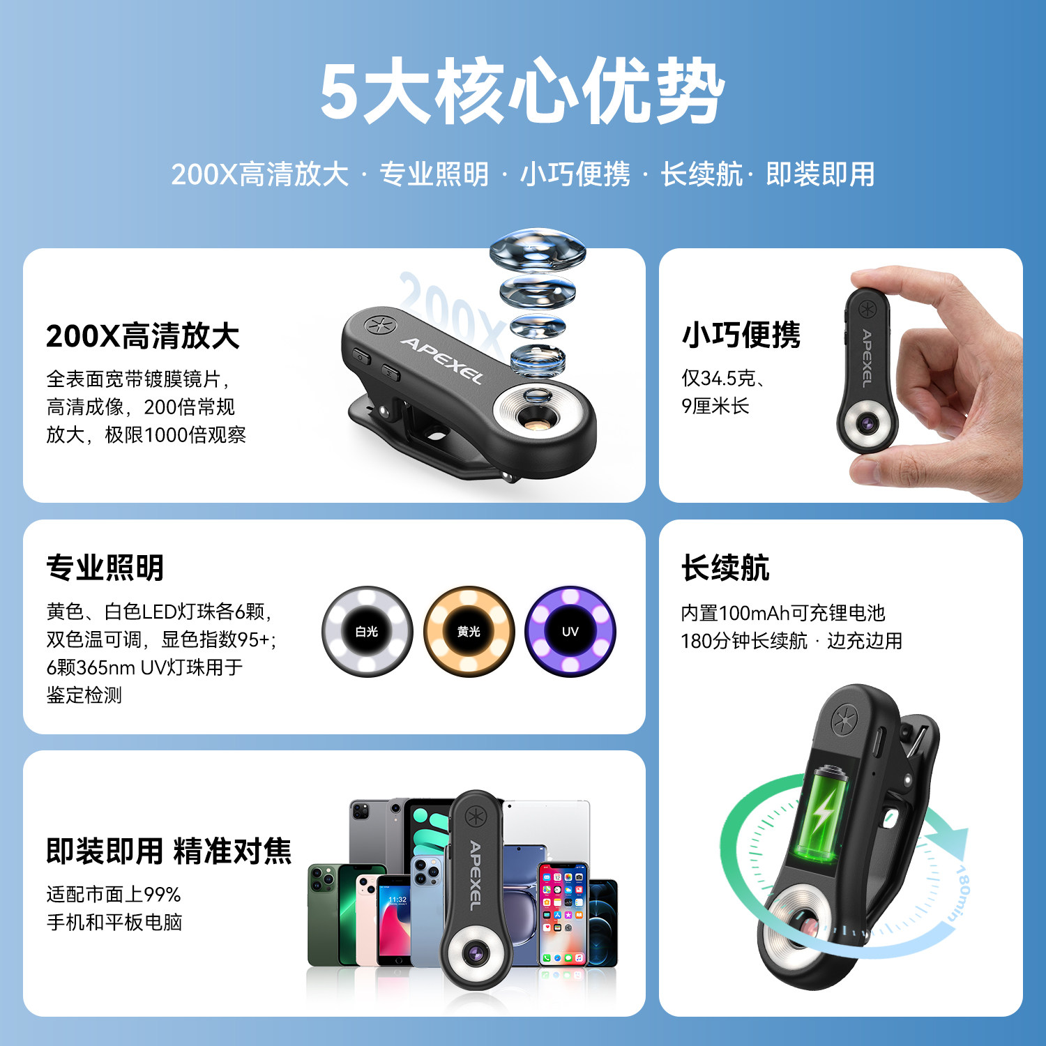 壳比2026新款手机显微镜200X高清手持放大镜带灯200倍手机镜头显微镜迷你便携式瓷器古董珠宝玉石古玩鉴定拍