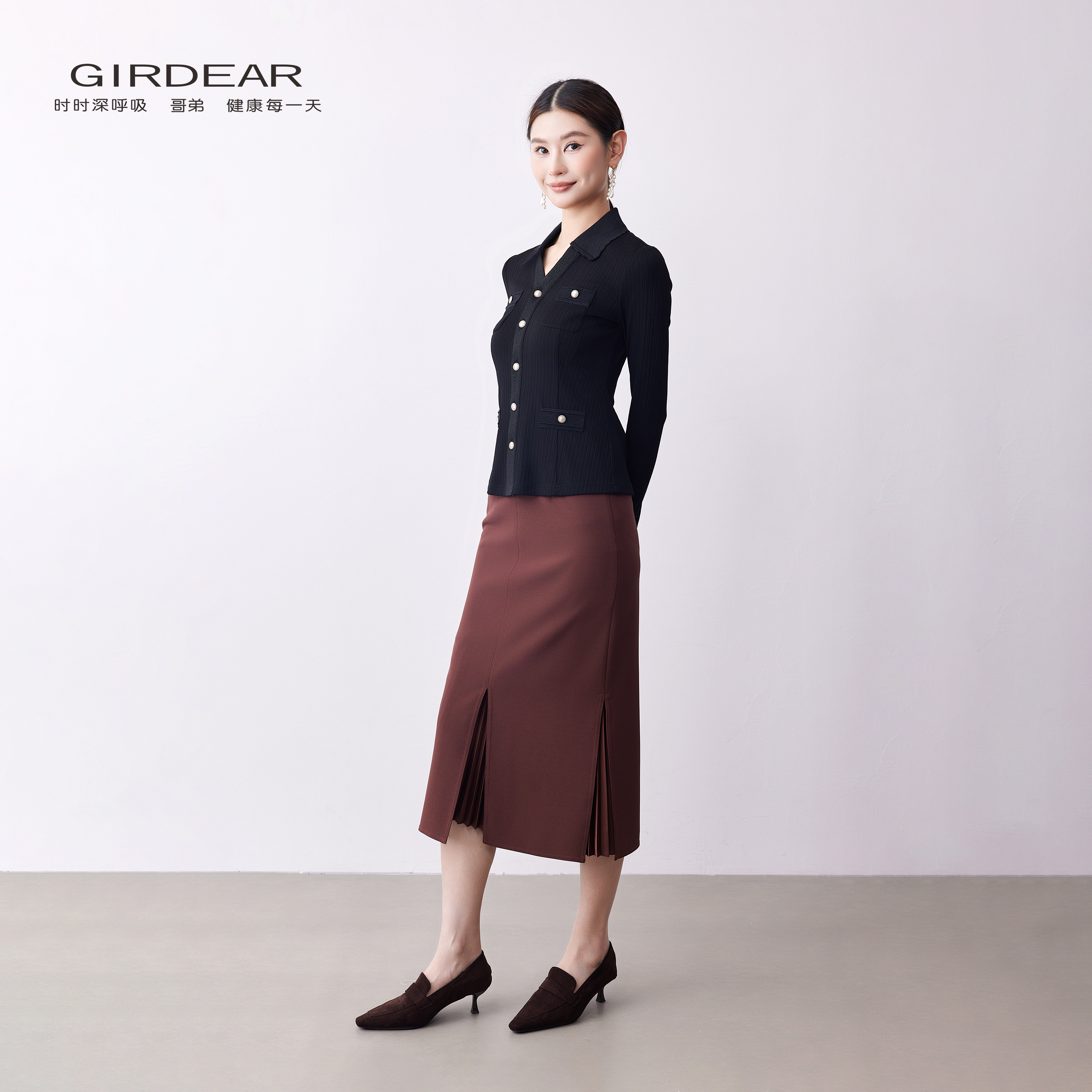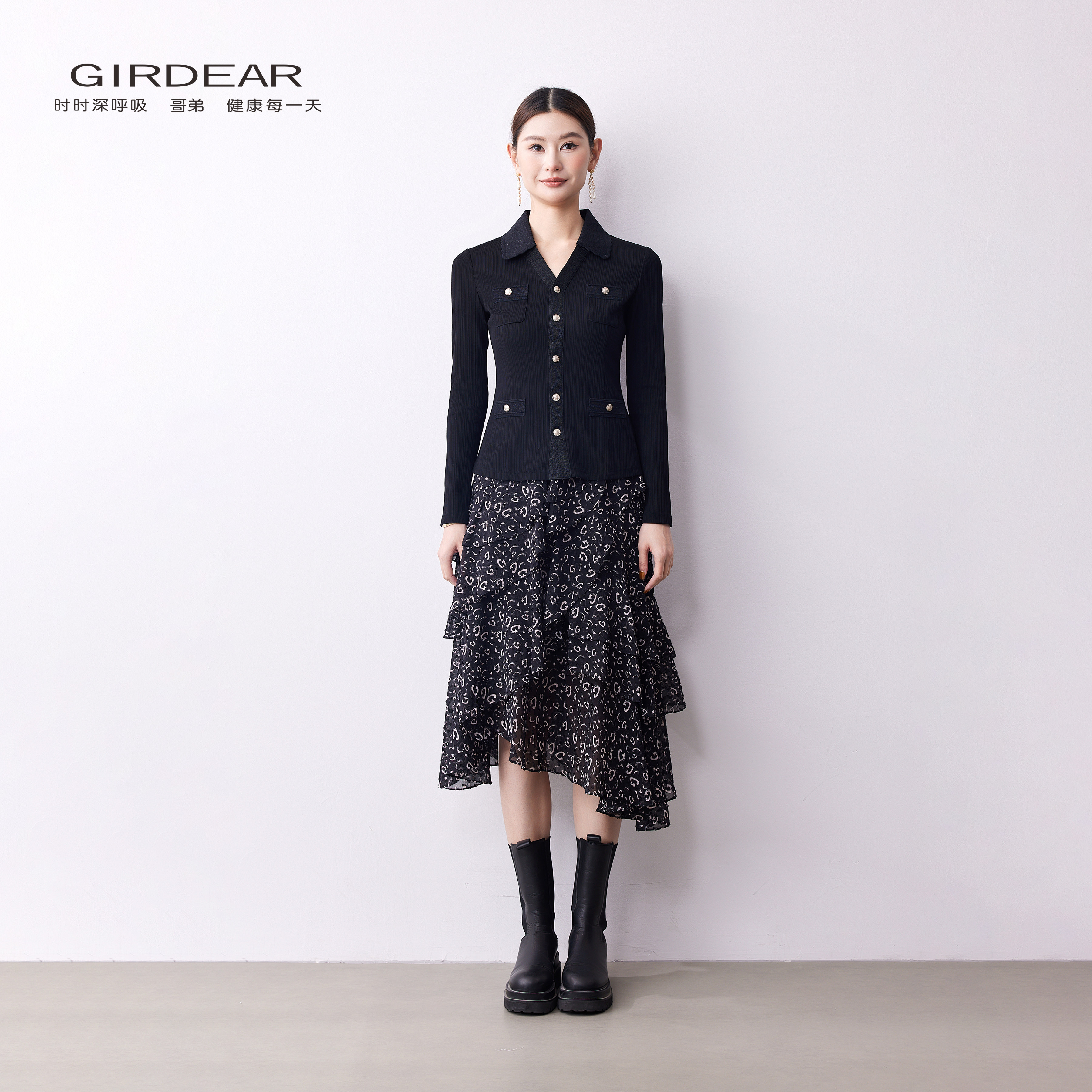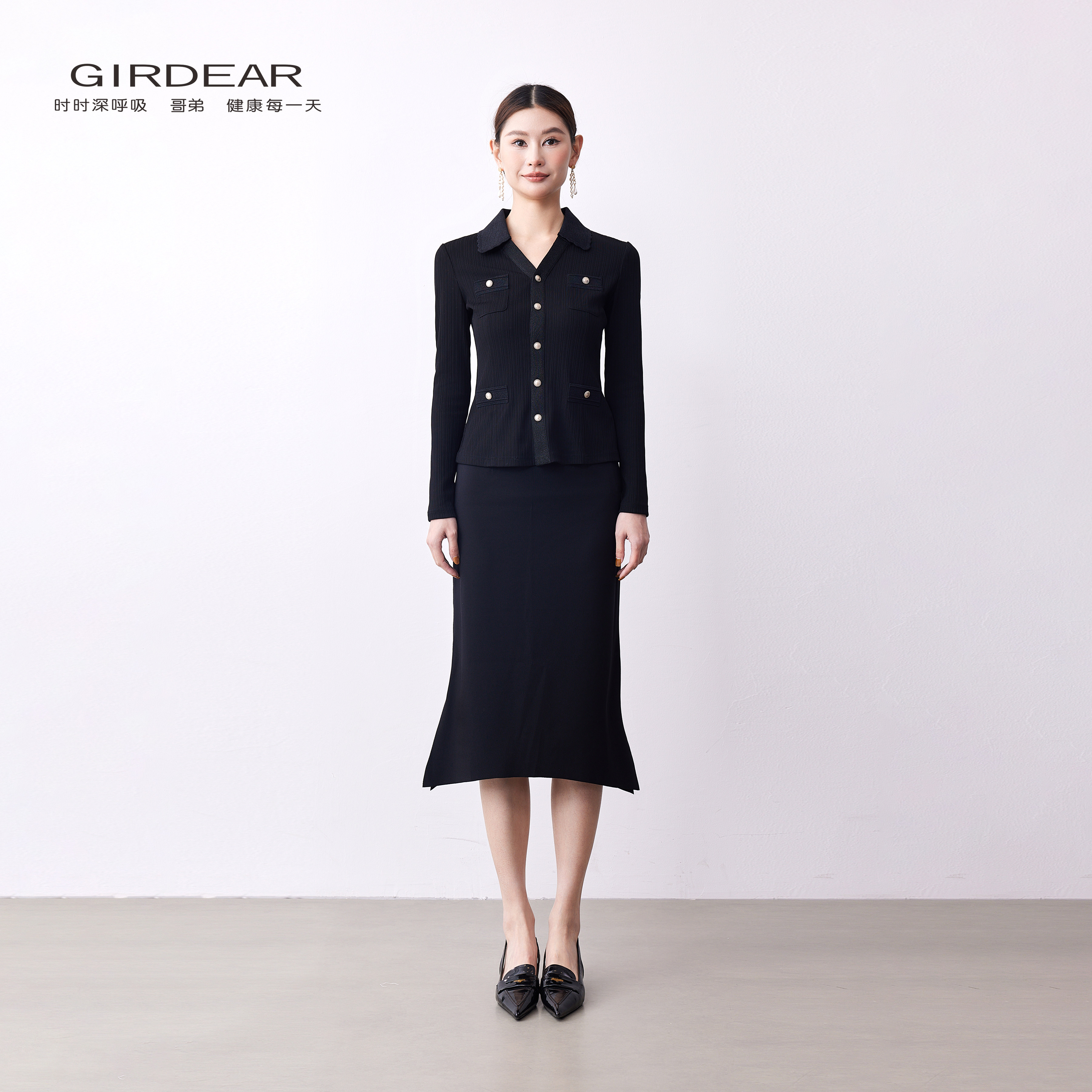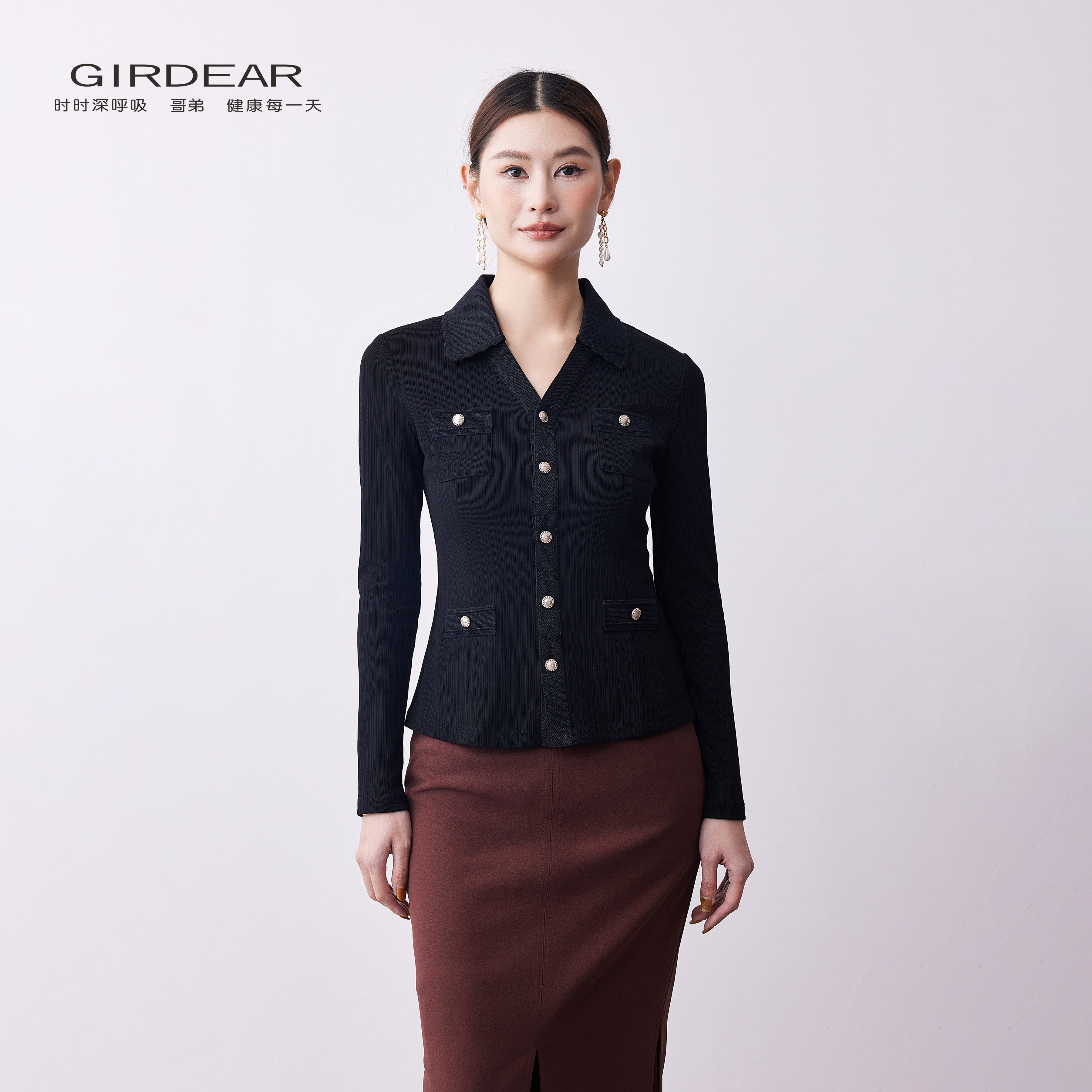 Girdear/哥弟春夏通勤翻领显瘦长袖针织衫修身小香风针织1300952