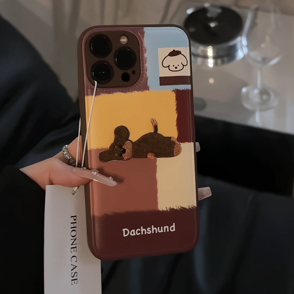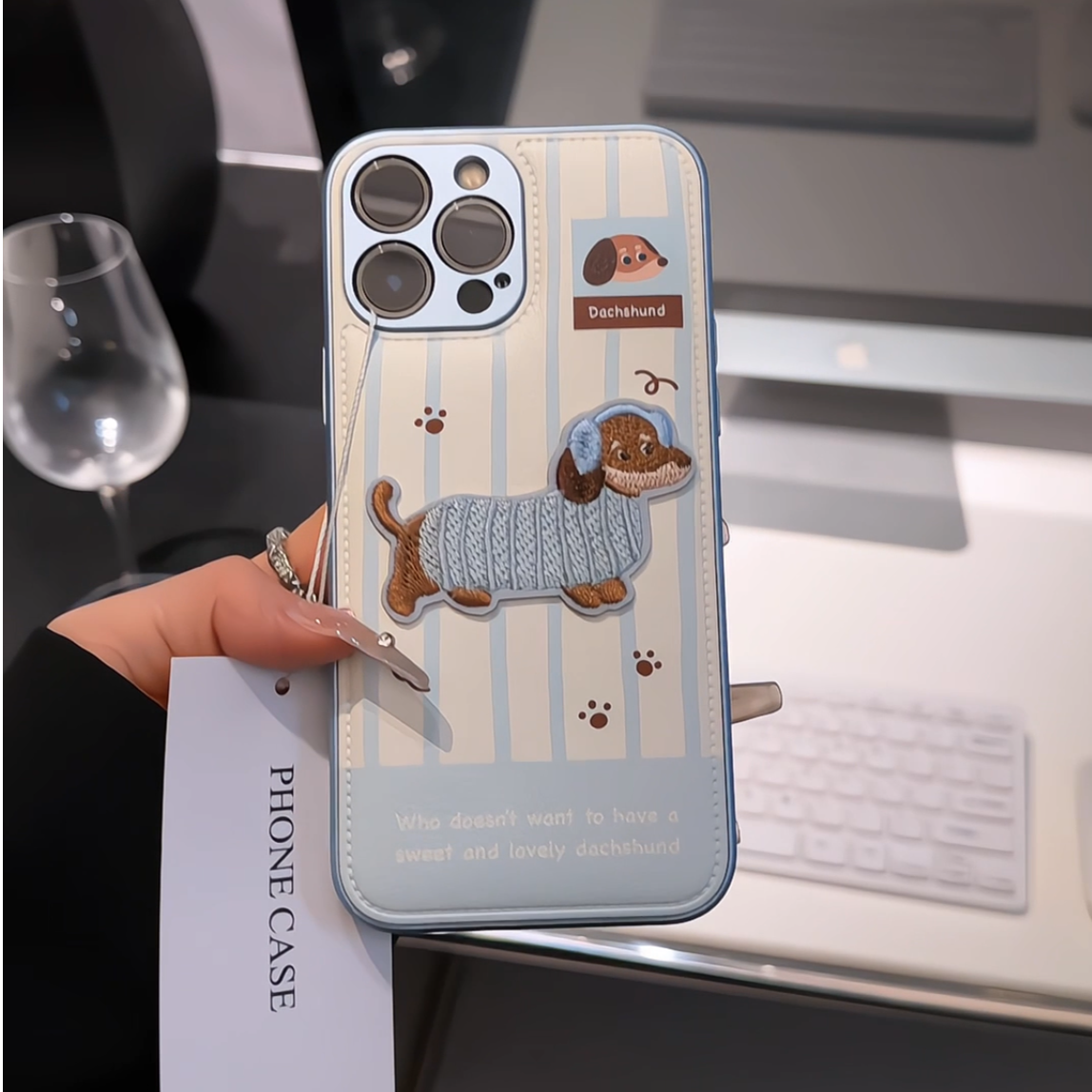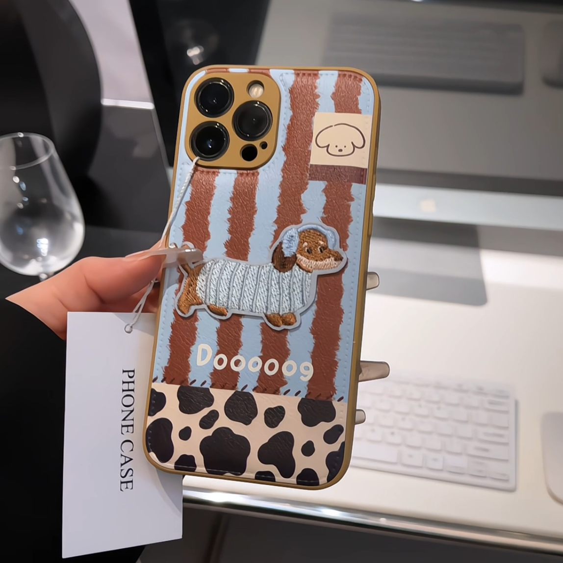 复古拼接刺绣狗肤感直边皮纹鼓包适用苹果16pro手机壳iphone15创意风小众华为p60全包mate60保护套红米小米14