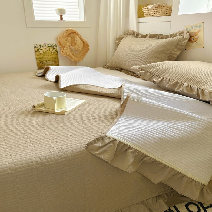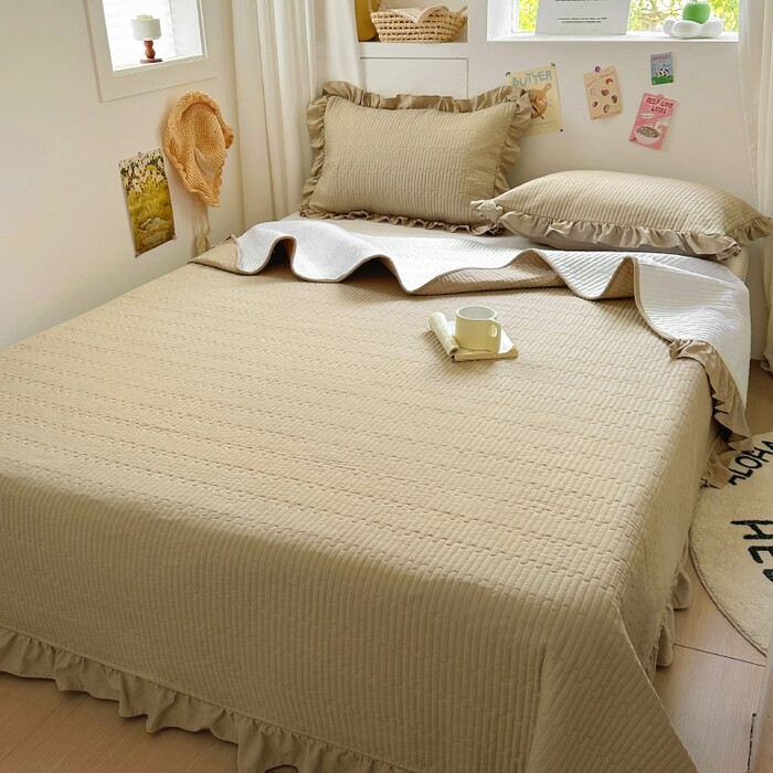 花边夹棉床盖三件套纯色水洗棉大花边款式枕套加厚防滑床裙床单