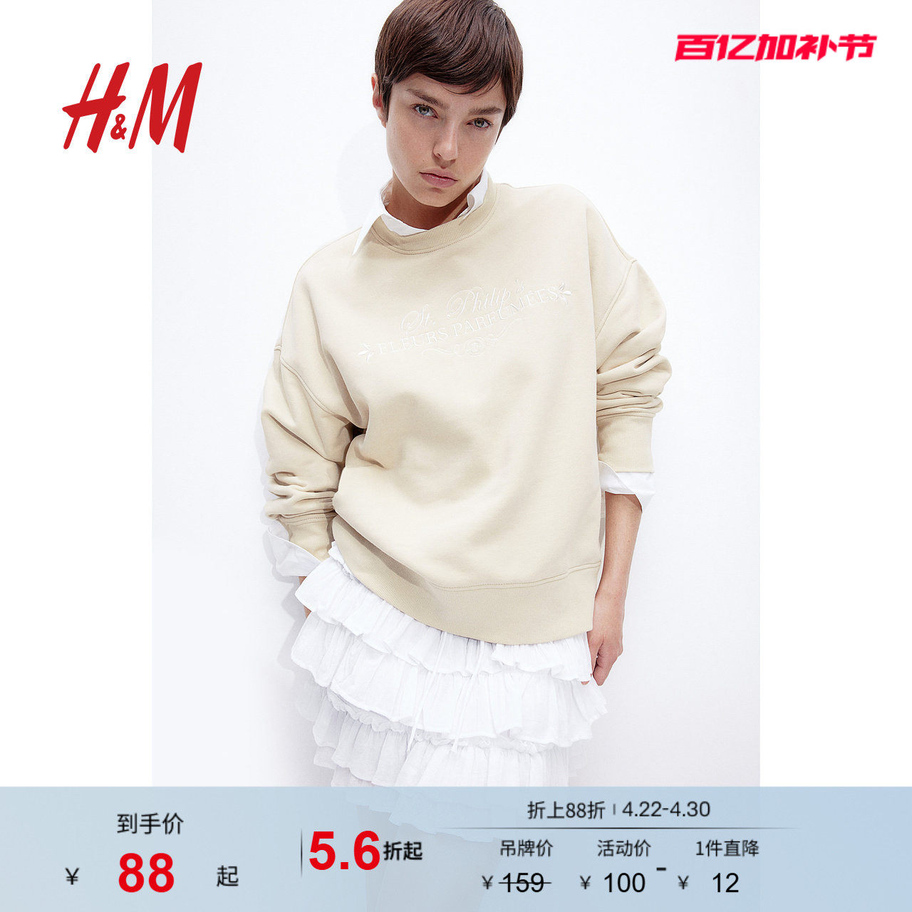 HM女装卫衣夏季棉质舒适大廓形图案圆领长袖绒衫1195824