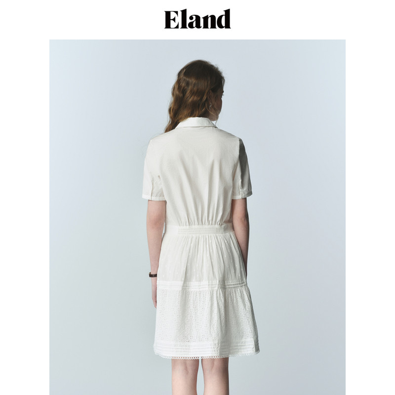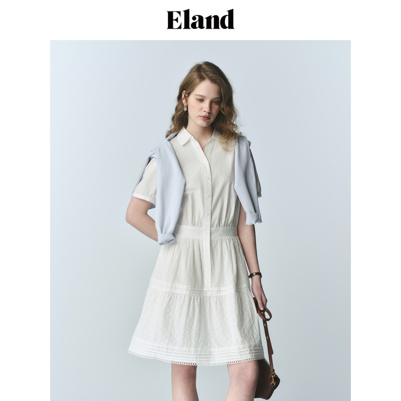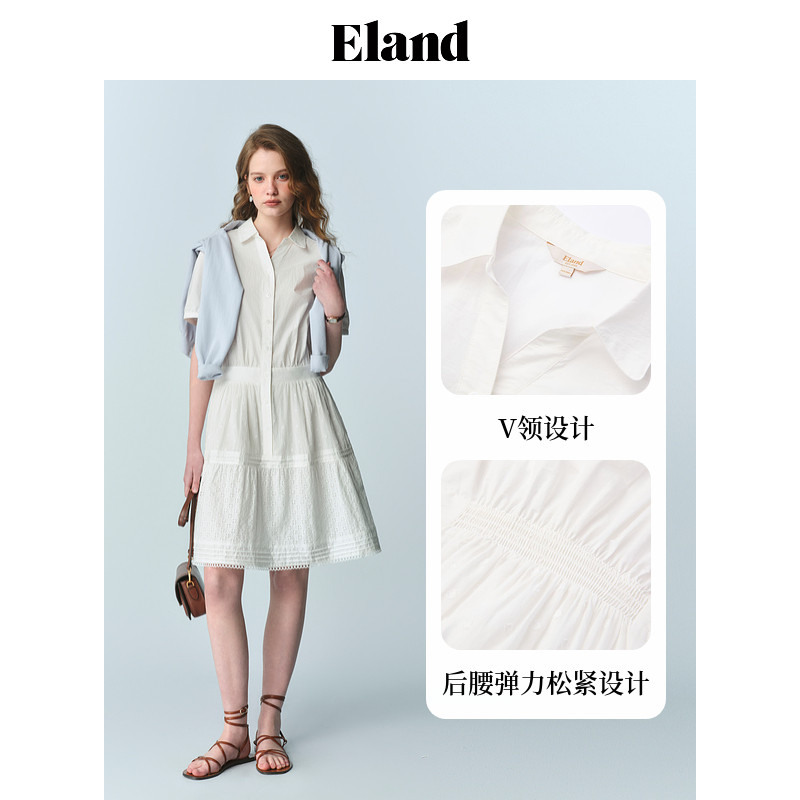 【83%棉】Eland衣恋衬衫连衣裙女v领弹力松紧腰裙子2025夏季新款