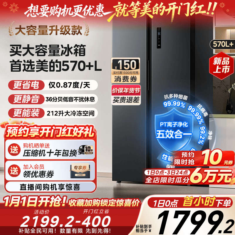 美的570+/606对开双开门两门大容量家用冰箱一级节能风冷无霜超薄
