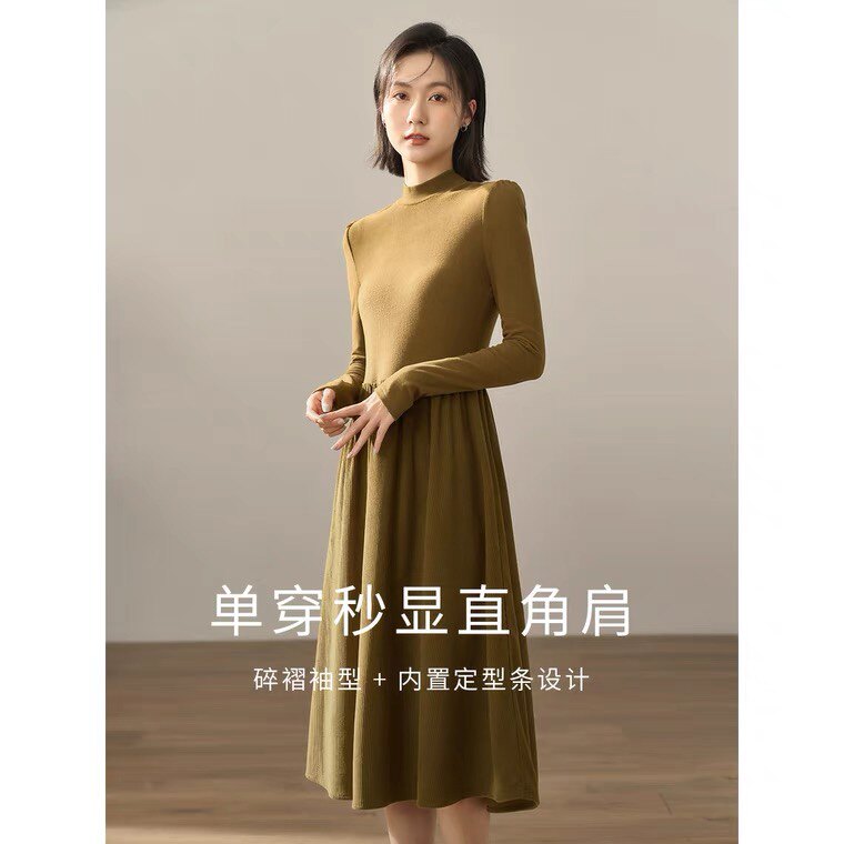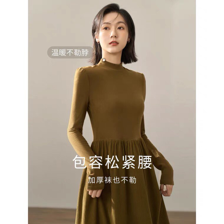 复古拼接连衣裙女2025冬新款半高领长袖打底衫收腰a字半身裙