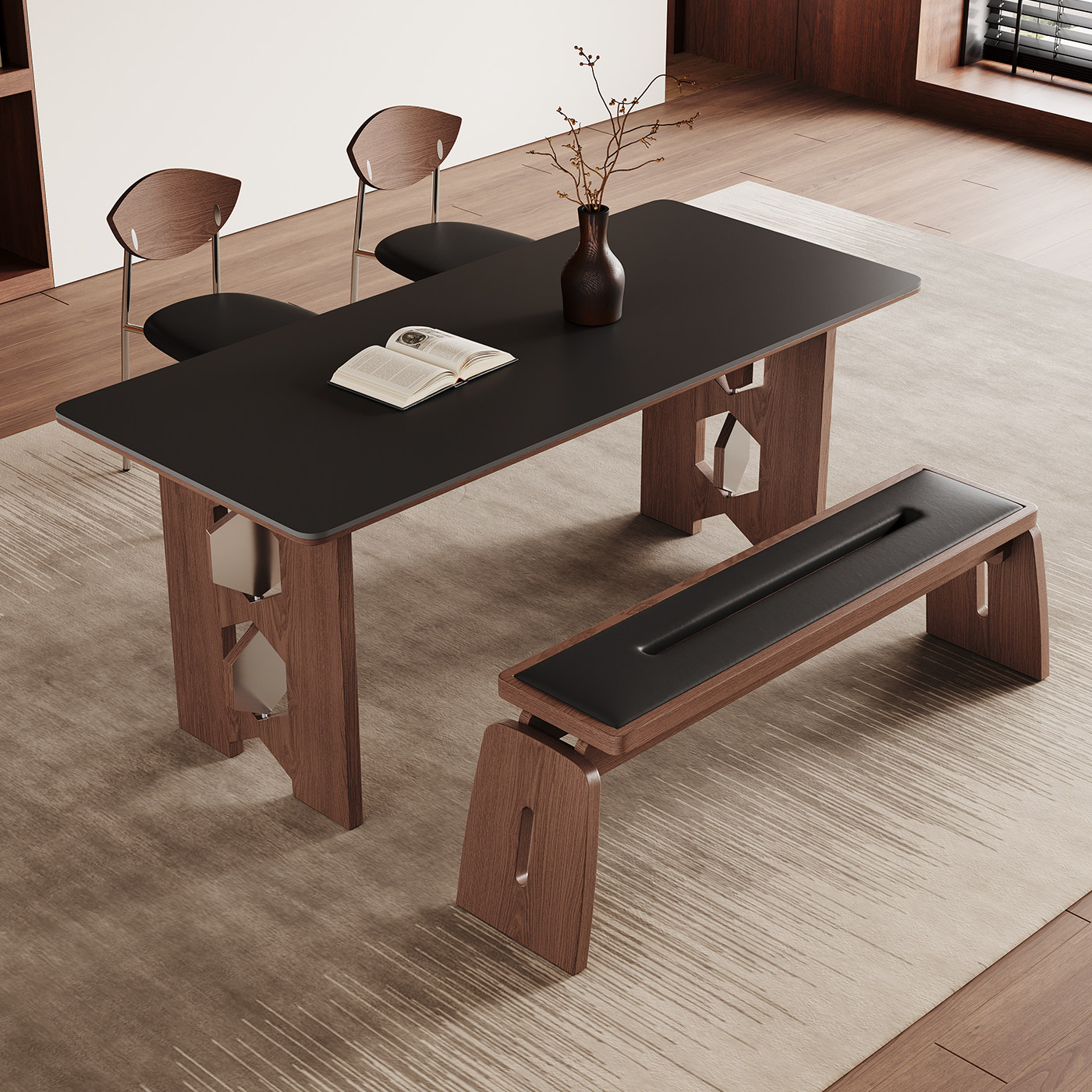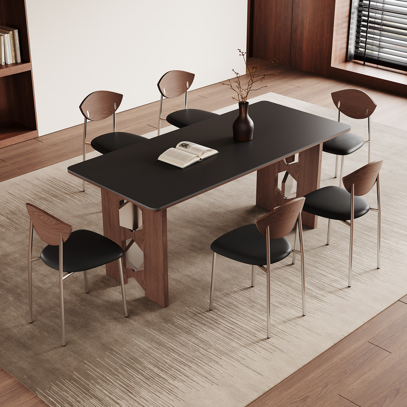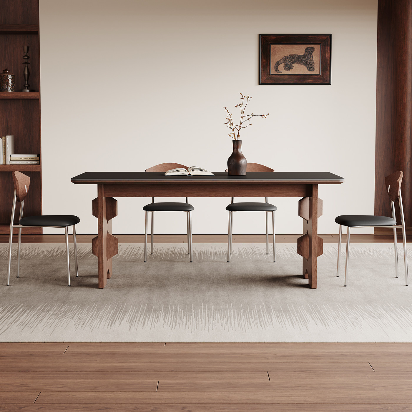 中古风实木餐桌家用小户型高端全托长方形黑色复古岩板餐桌椅组合