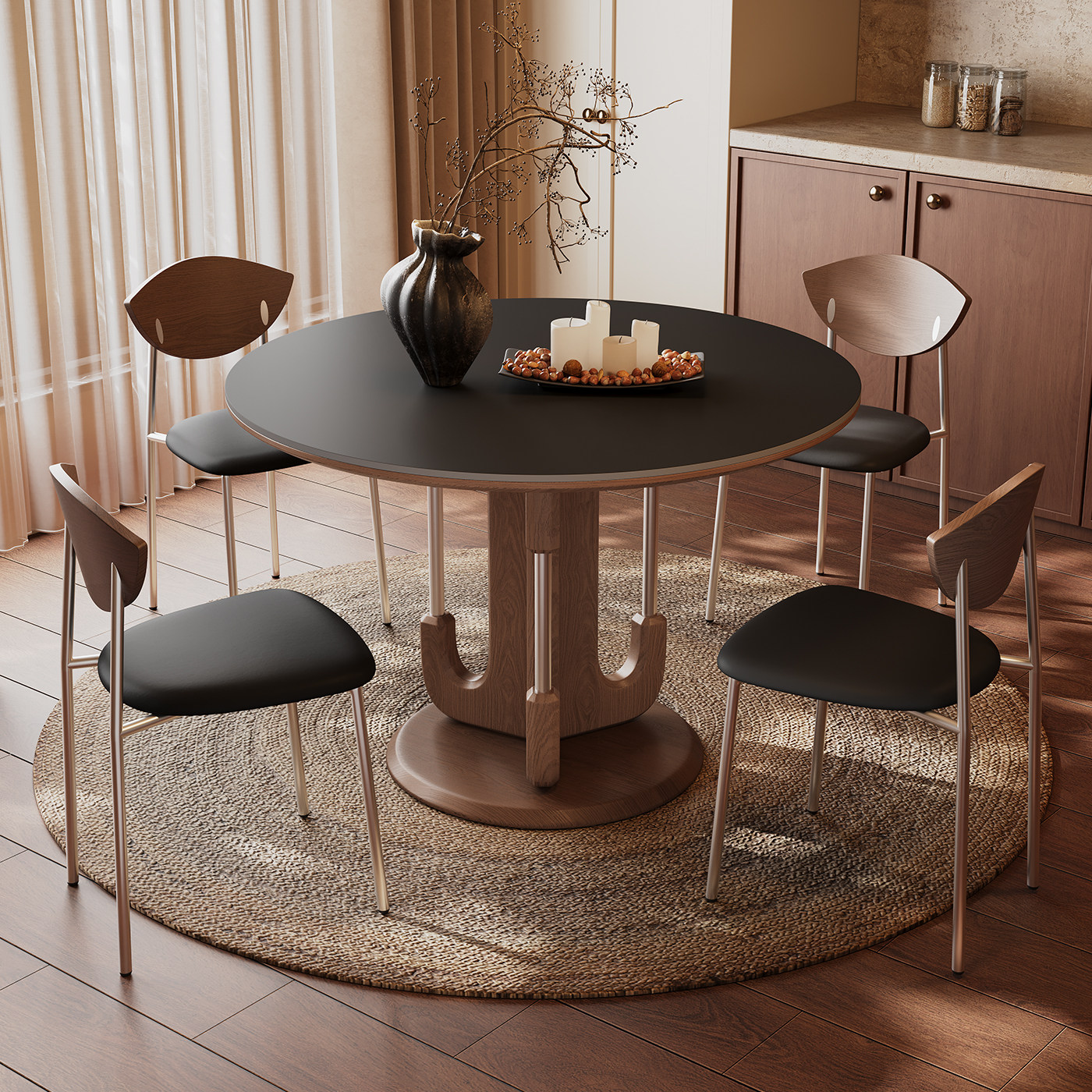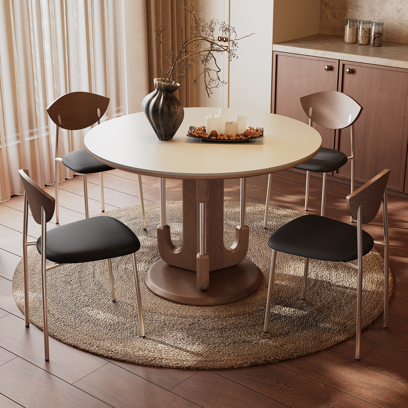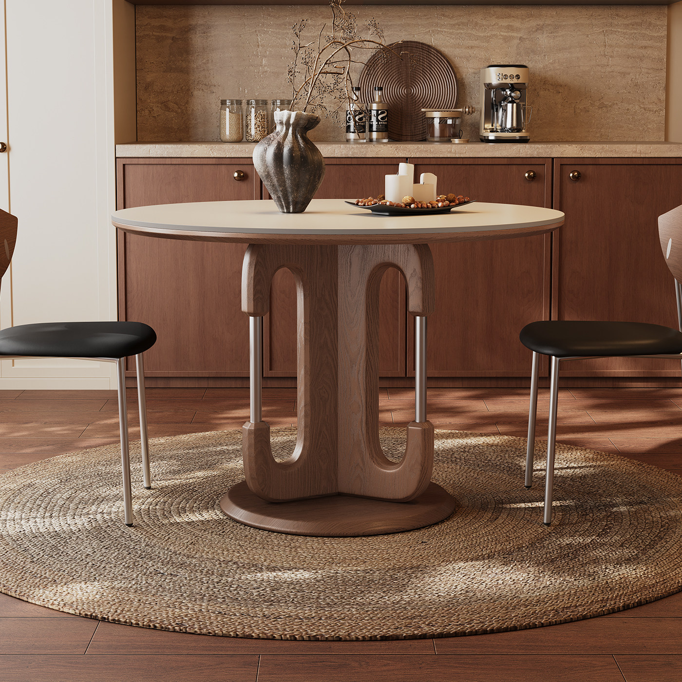 奥古斯特 包豪斯实木餐桌胡桃色中古风1米小户型新款纯白岩板圆桌