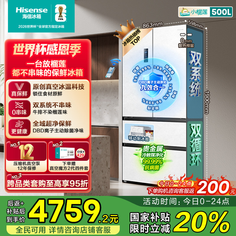 海信小榴莲500冰箱真空保鲜零嵌入法式四开门双系统超薄制冰一级