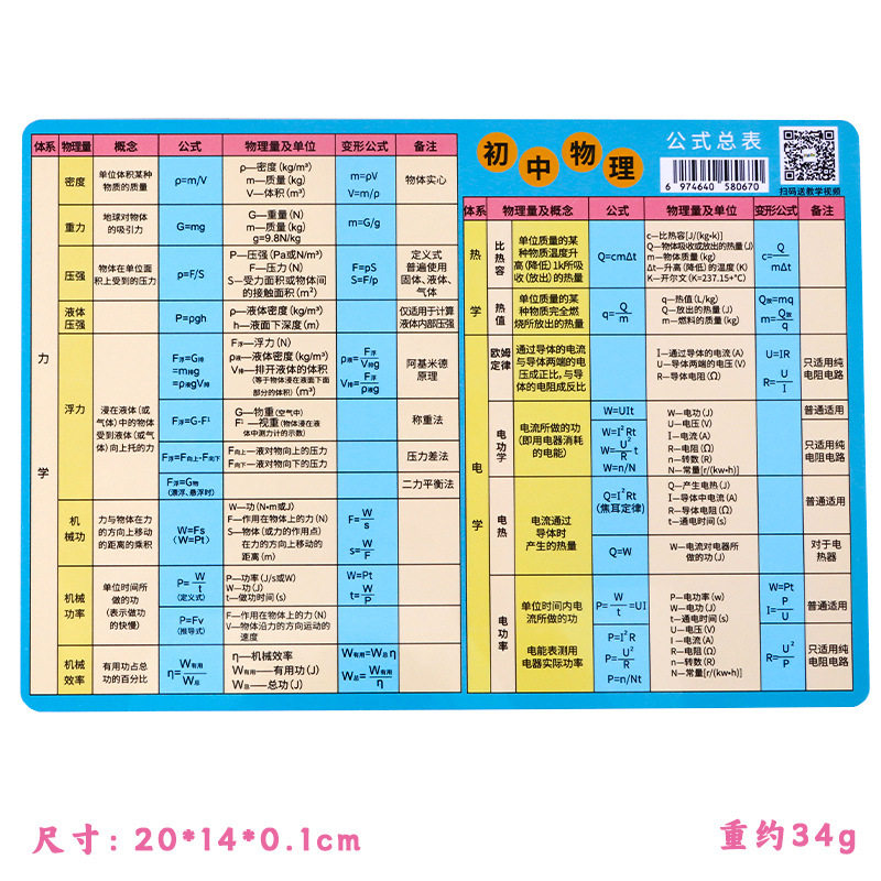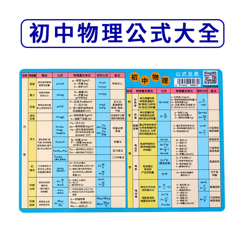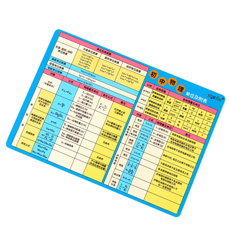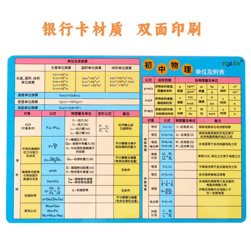 初中物理公式及单位换算大全知识点速记挂图卡片物理公式记忆手卡