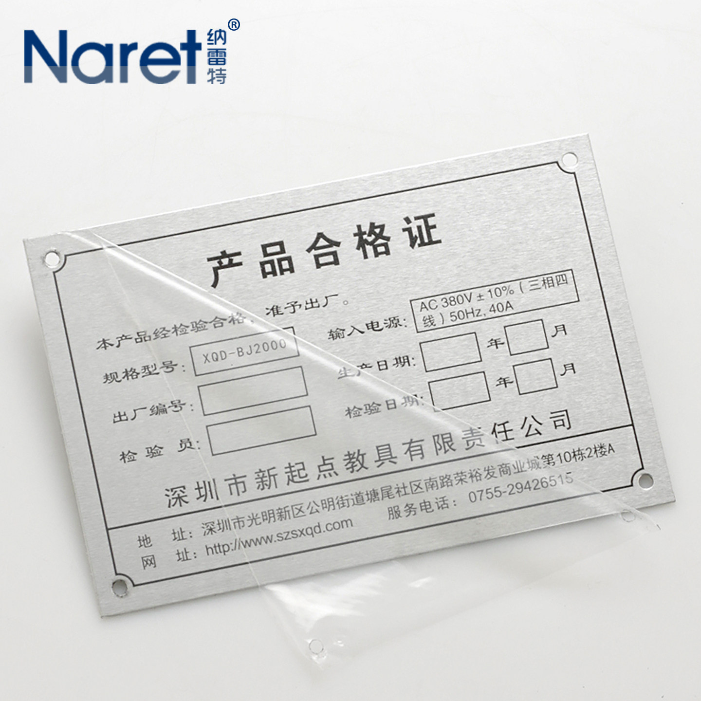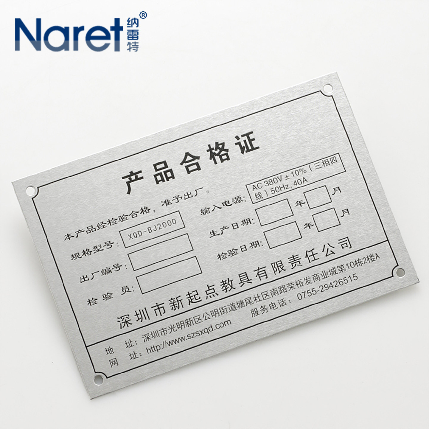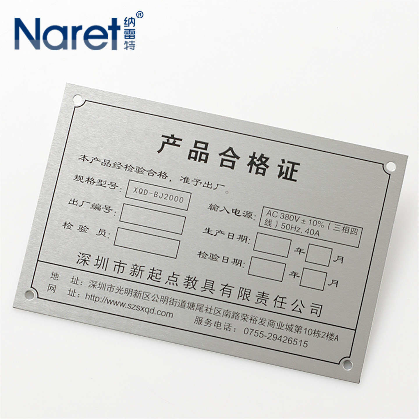 纳雷特 产品合格证专用章铝制铭牌定做金属标签机器机械设备出厂腐蚀标牌电器电器箱名牌丝印铝牌腐蚀标志牌