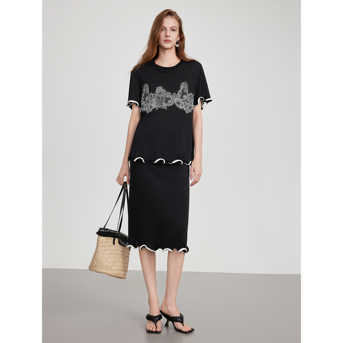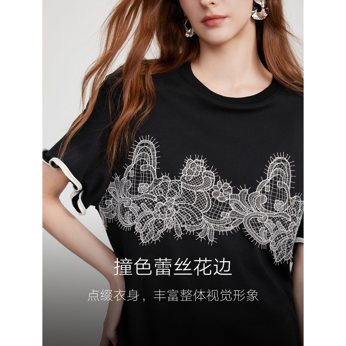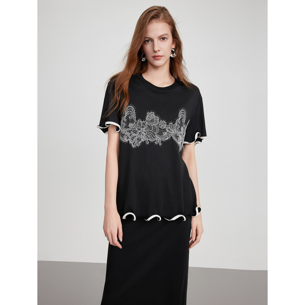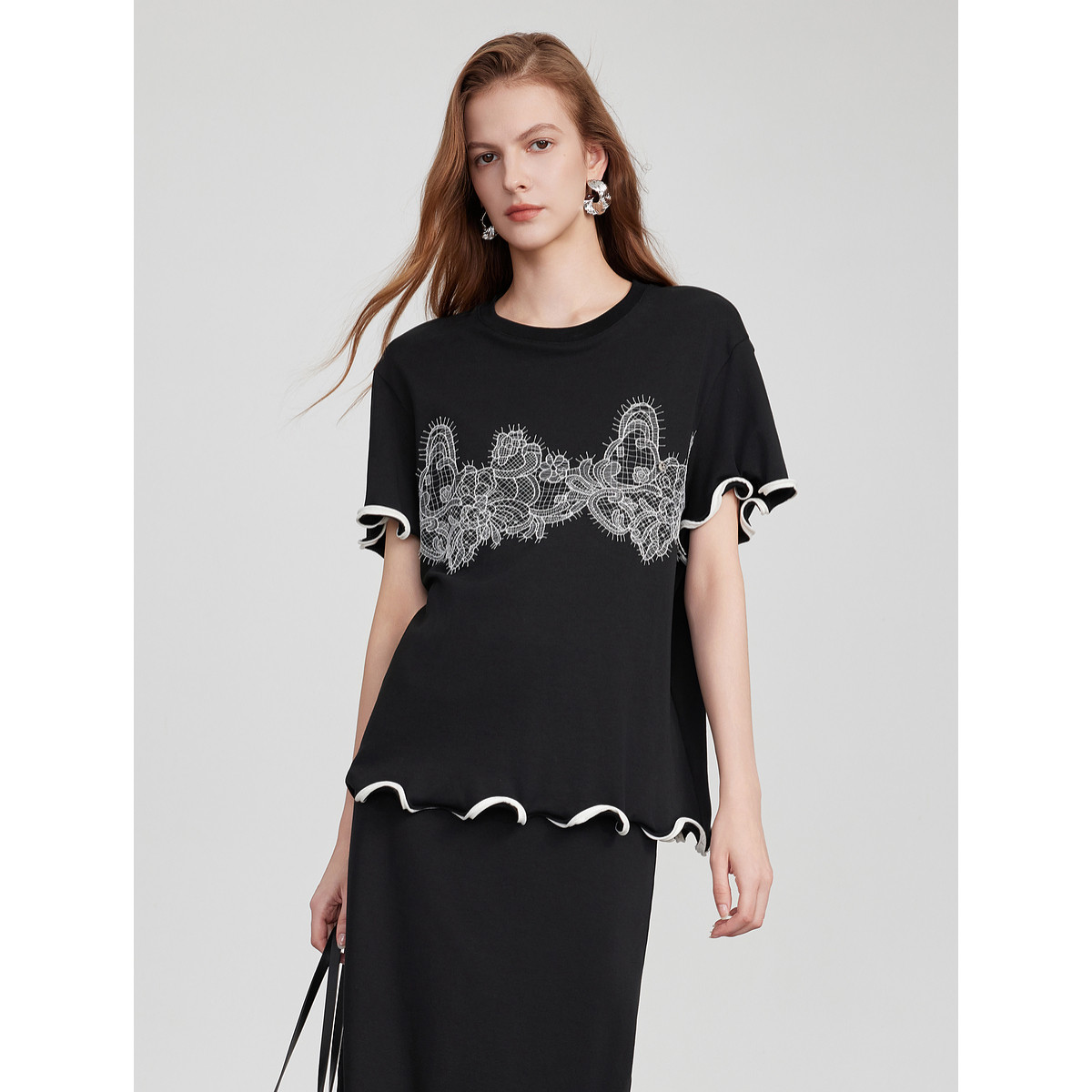 ELLE法式木耳边蕾丝短袖女2025夏季新款撞色时髦小众通勤正肩T恤