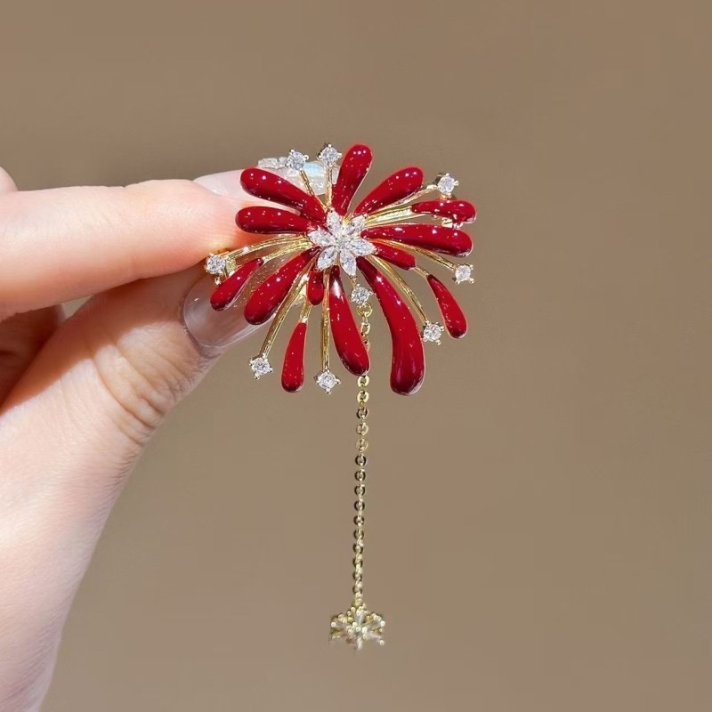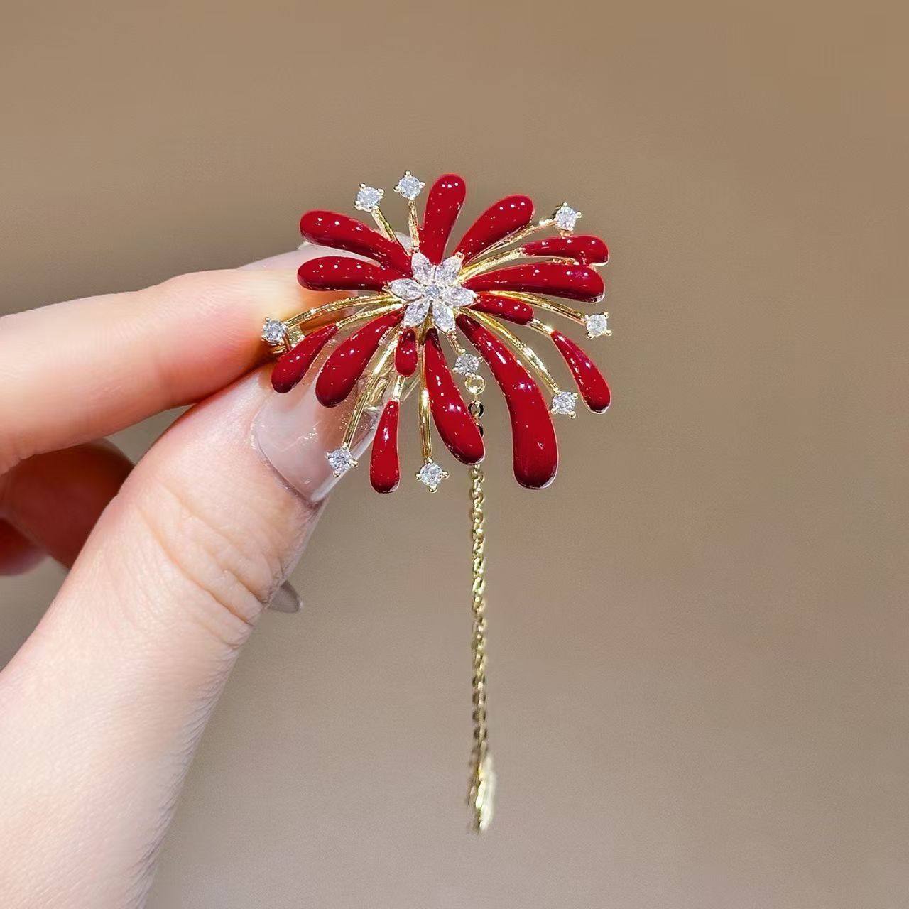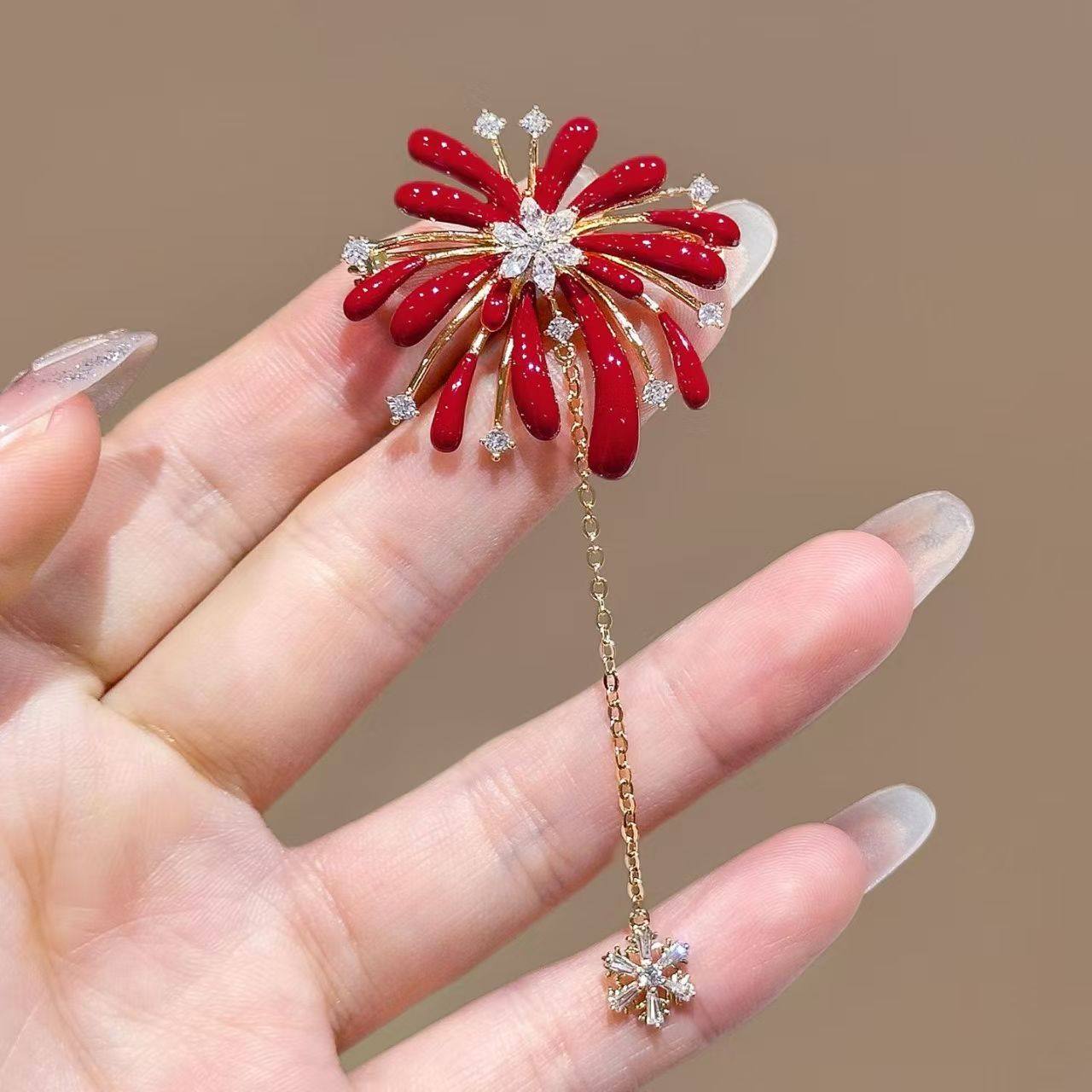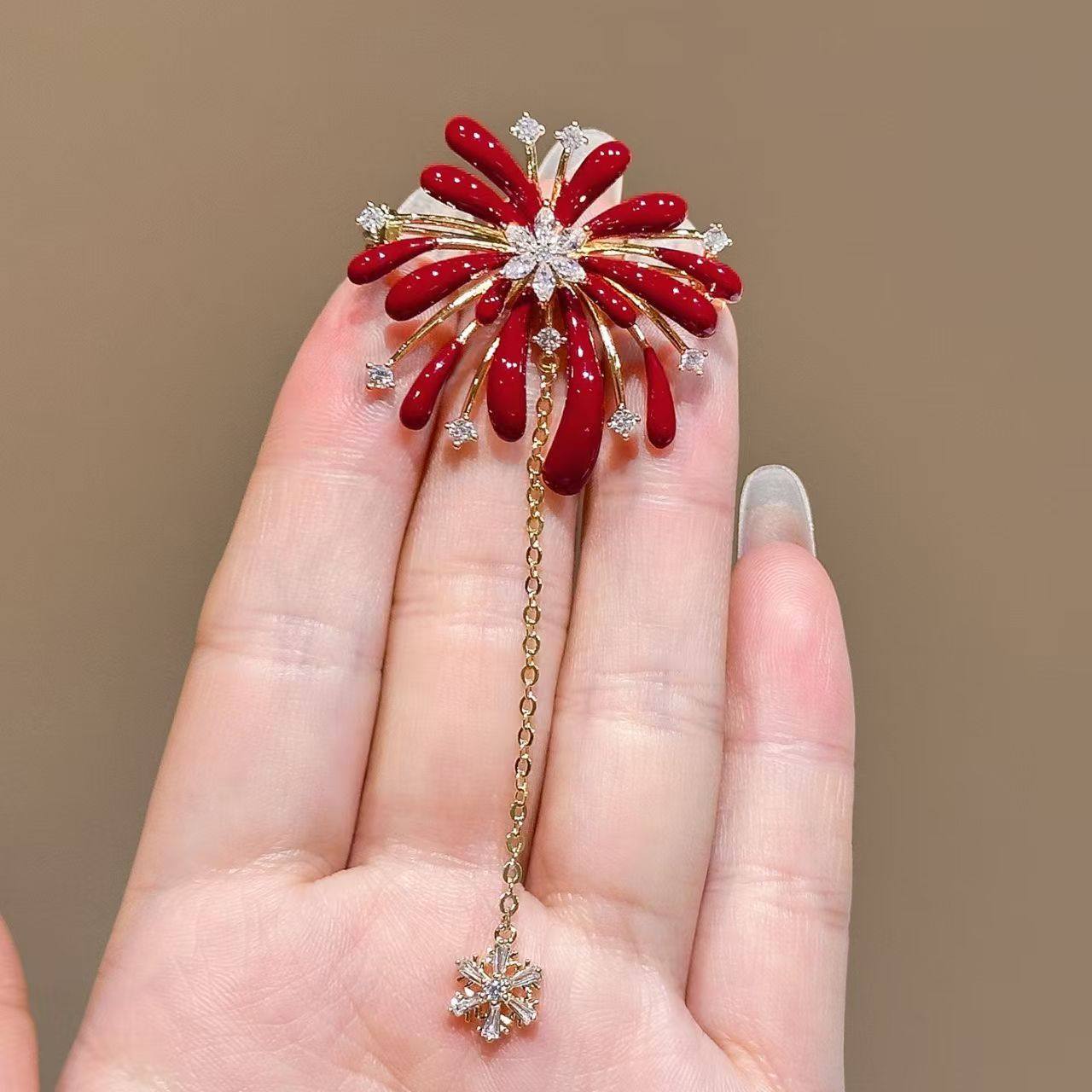 新年红色滴釉烟花胸针女闪钻流苏高级装饰别针2025新款胸花配饰品