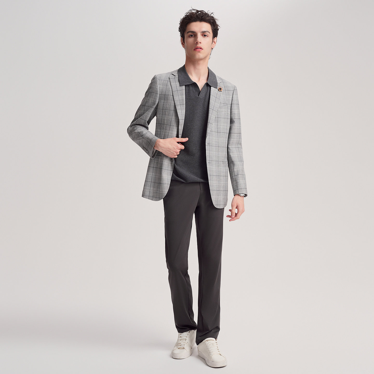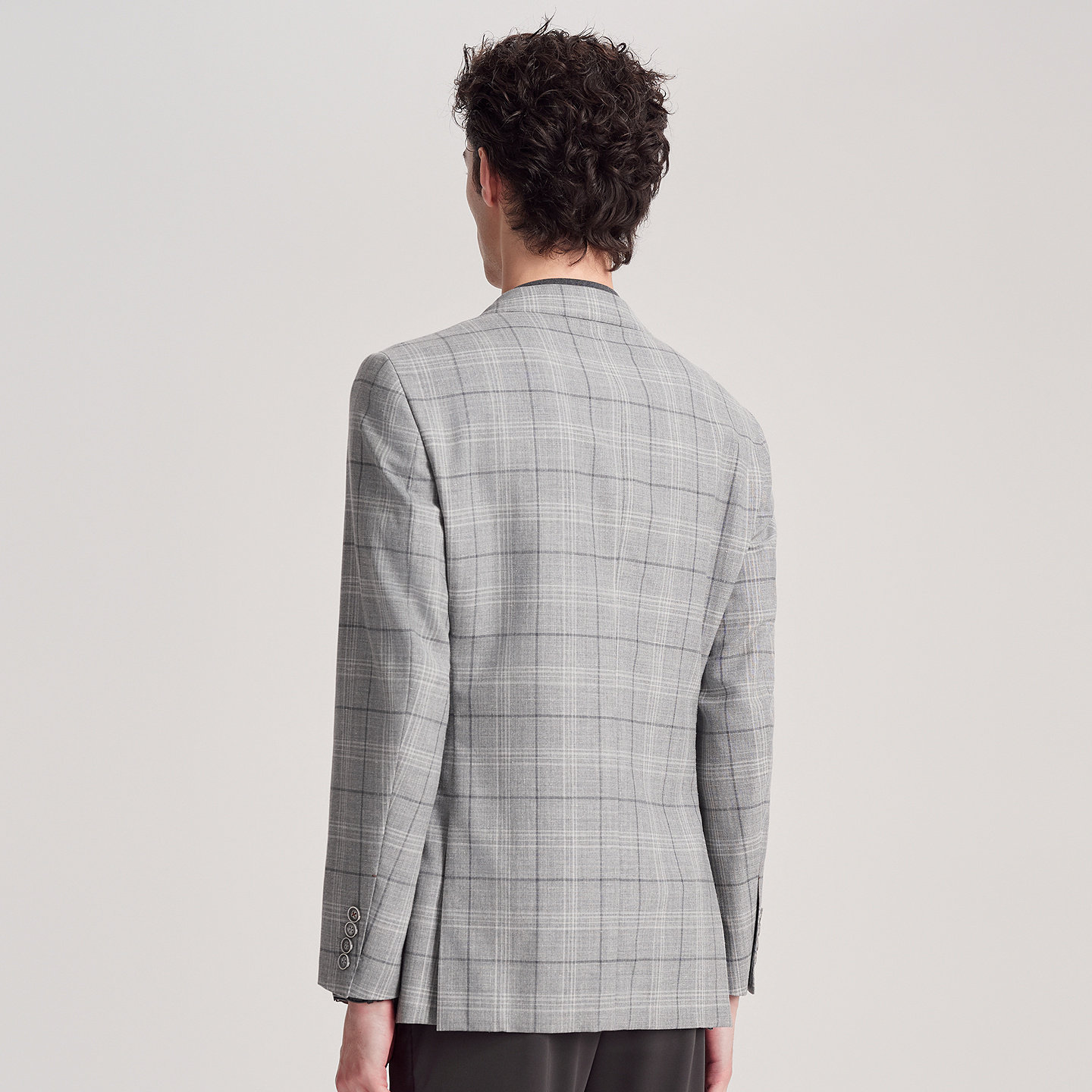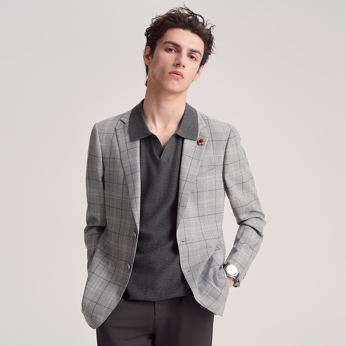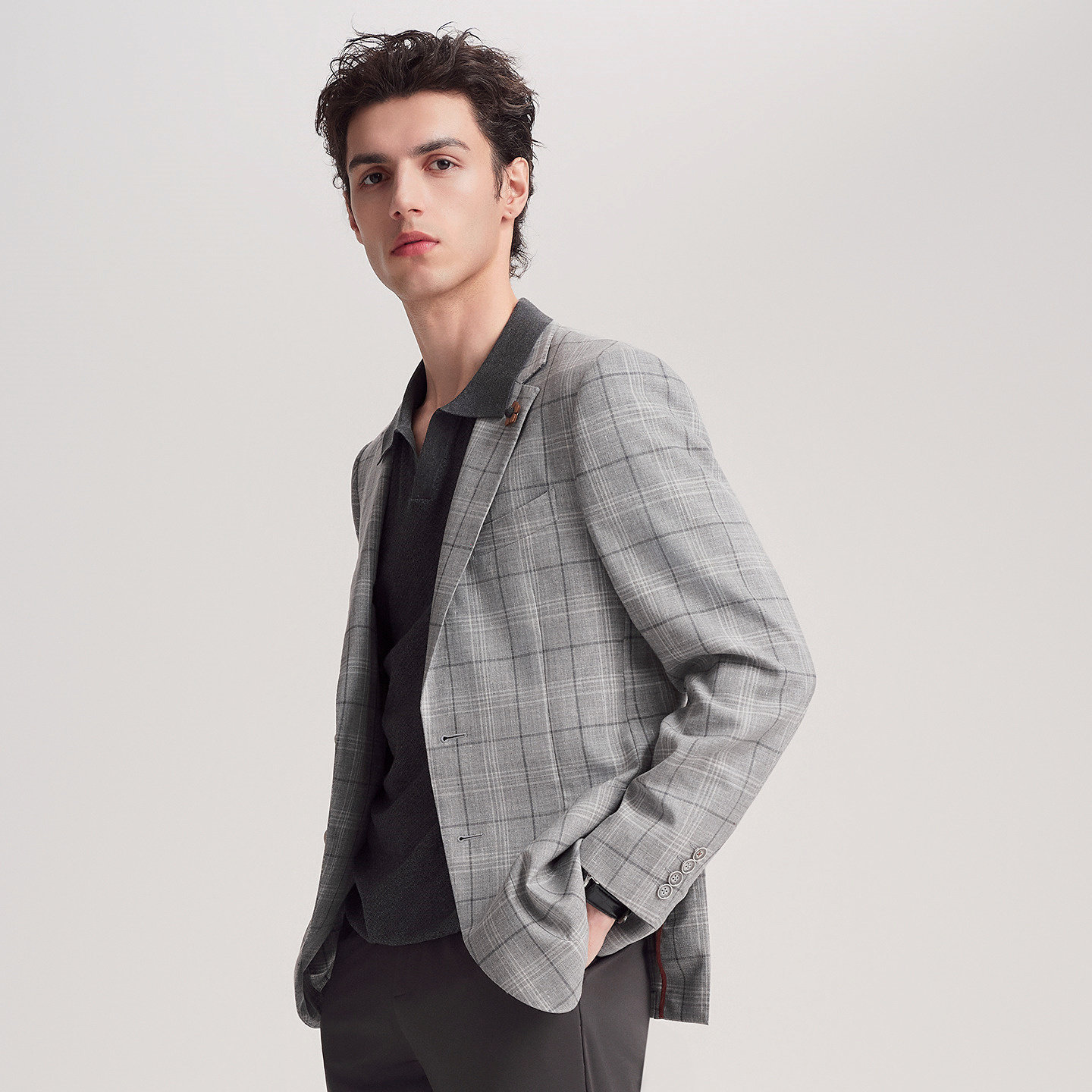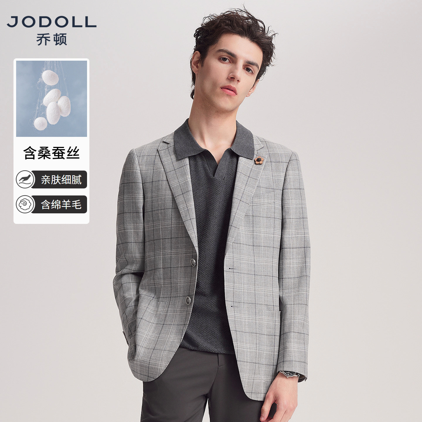 JODOLL乔顿【绵羊毛桑蚕丝】西服男高级感商务修身灰色格子小西装