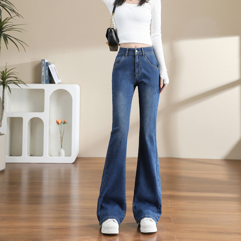 王家有鱼秋季新款2025复古蓝微喇牛仔裤中高腰不贴腿显瘦裤子女款