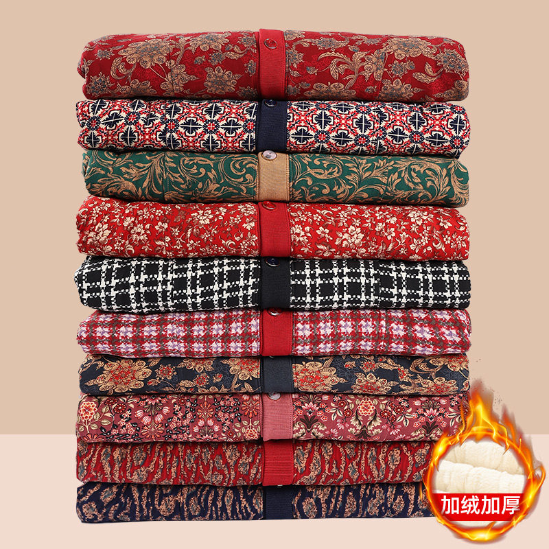 妈妈长袖打底衫秋冬季德绒保暖上衣女中老年大码宽松加厚圆领秋衣