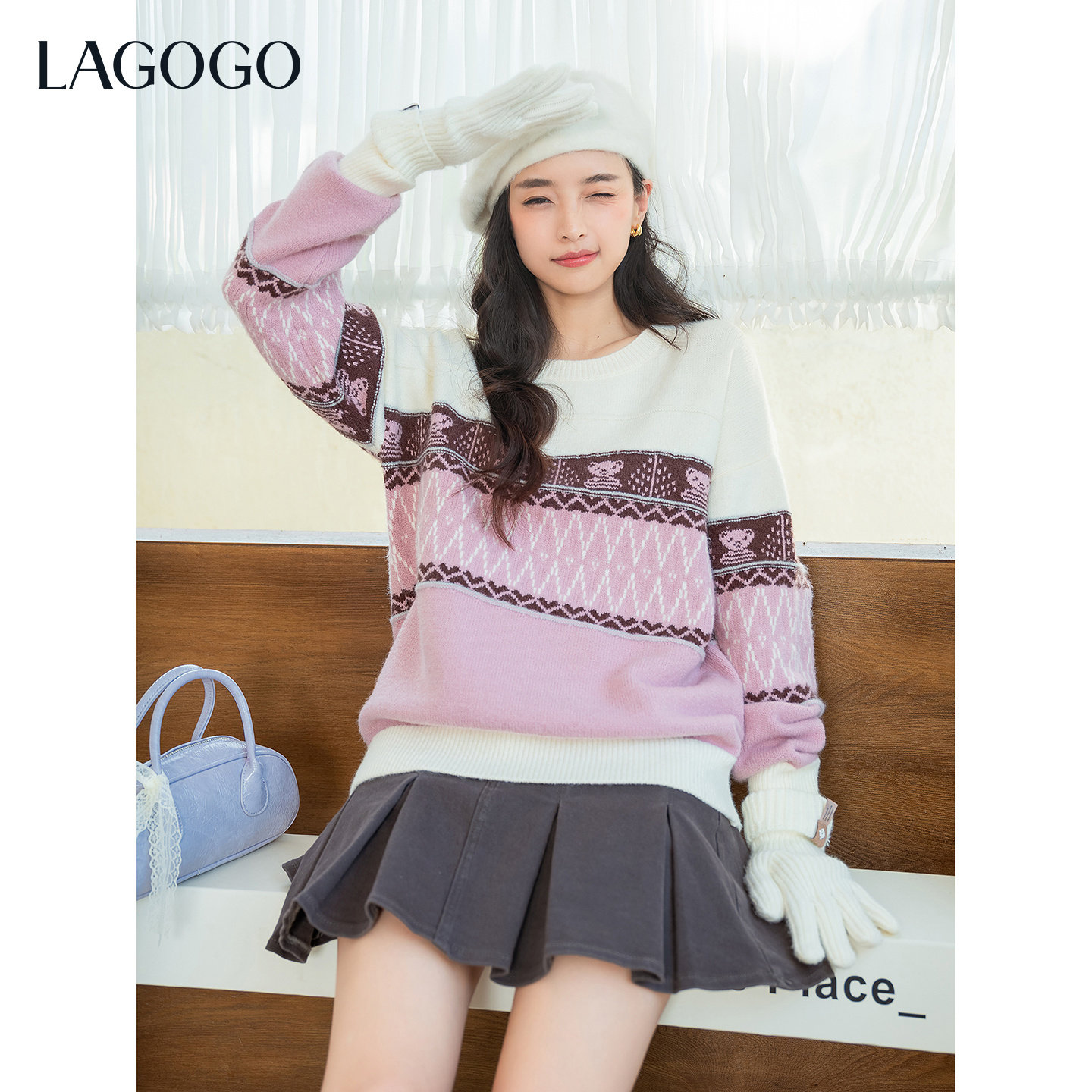 LAGOGO布达佩斯费尔岛毛衣女拉谷谷2025冬新款小熊提花甜美针织衫