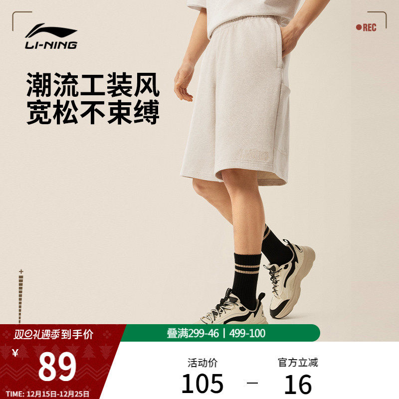李宁工装裤男士夏季新款运动短裤宽松休闲短卫裤刺绣针织运动裤男