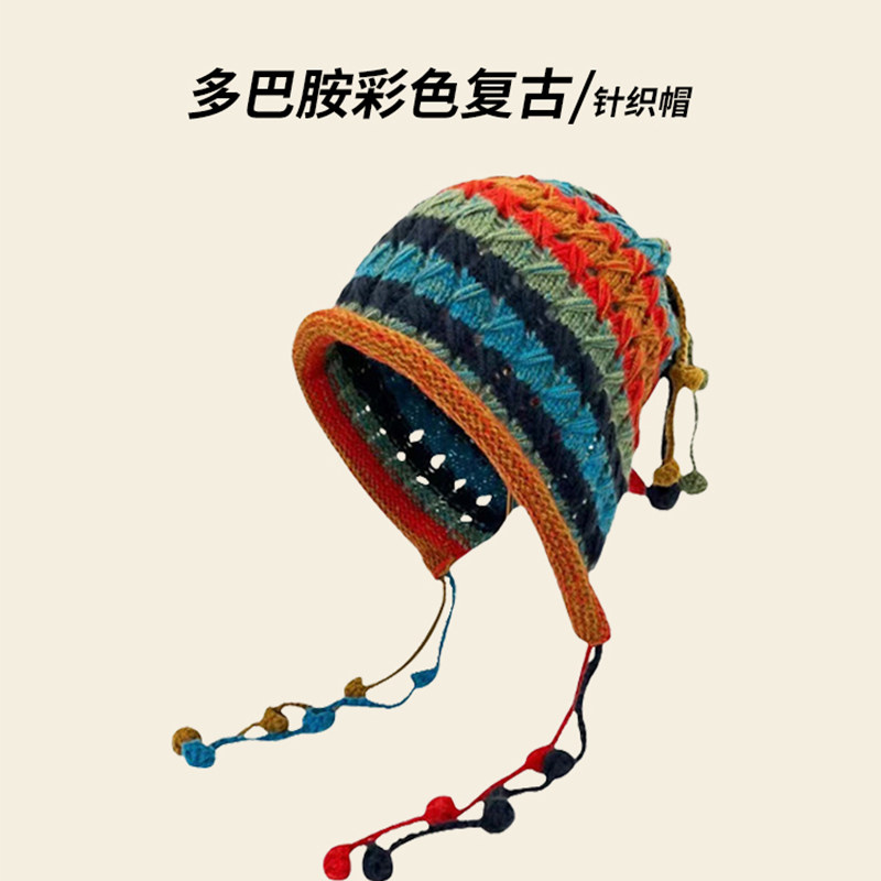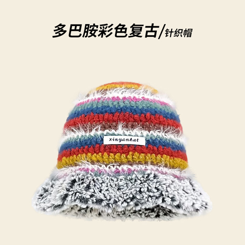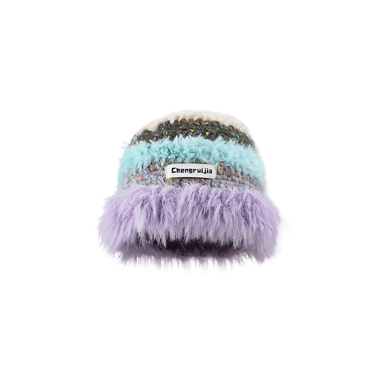 彩色手工针织毛线帽子秋冬季保暖毛绒渔夫帽女粉色针织帽紫色甜美