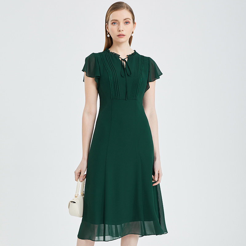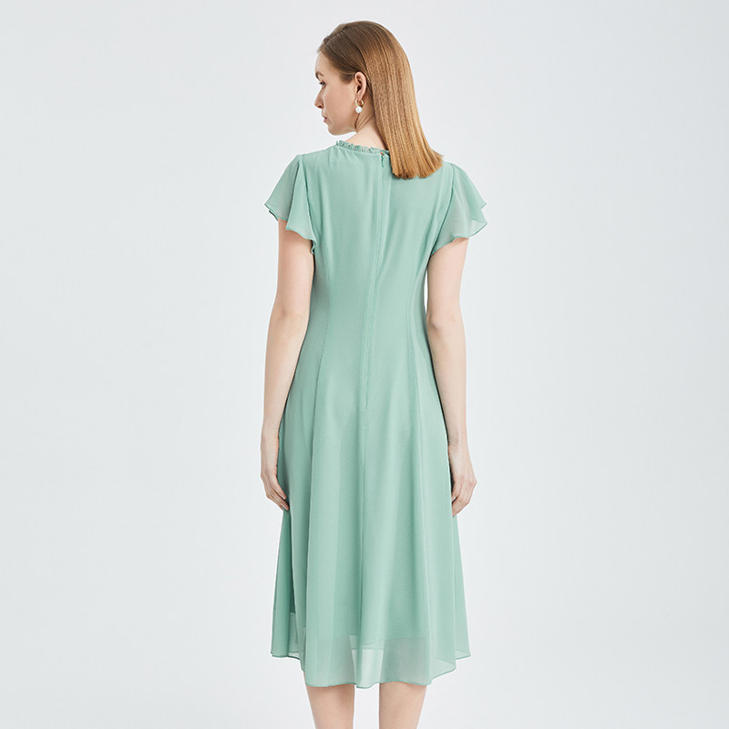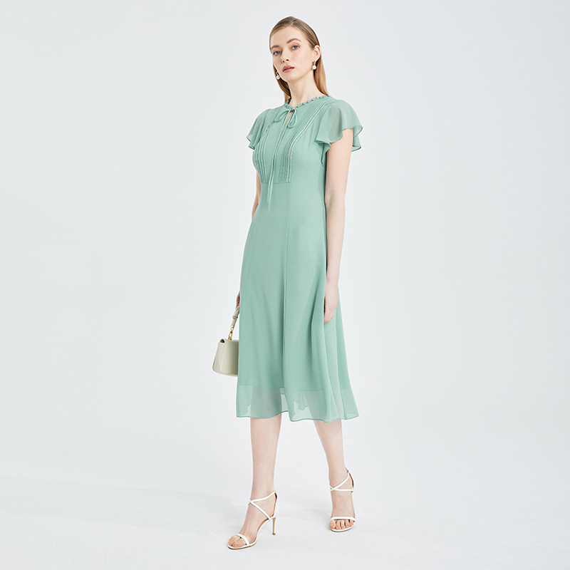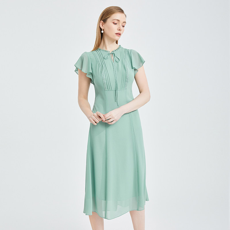 专柜正品马天奴女装春夏新品纯色荷叶袖连衣裙子褶皱高腰雪纺裙