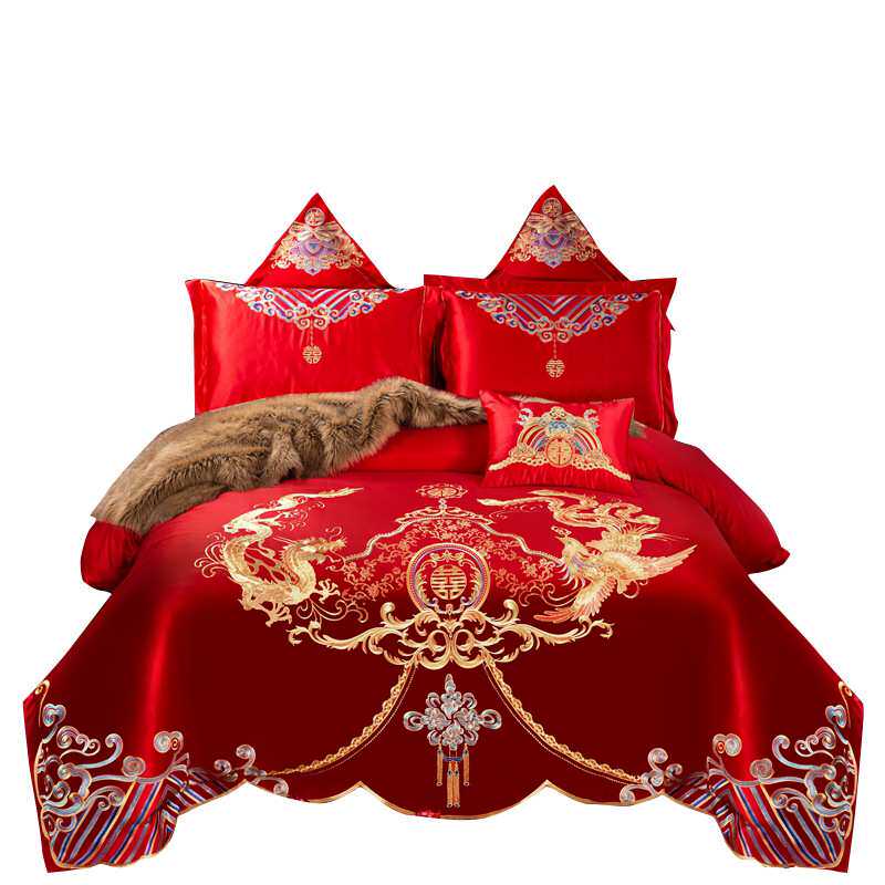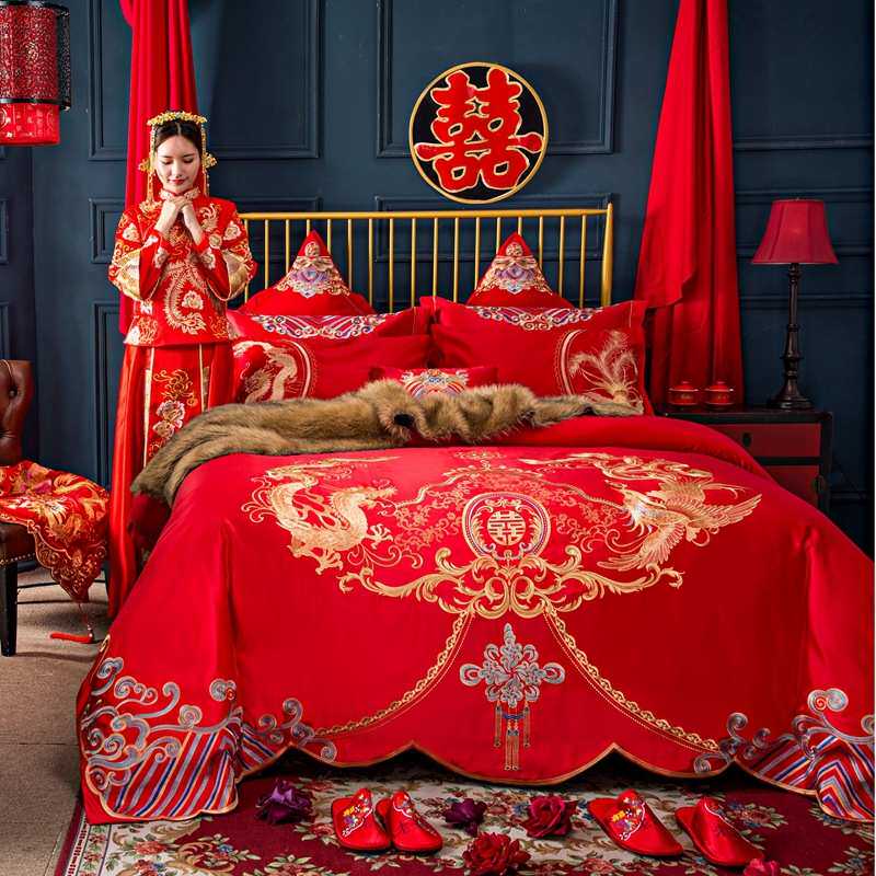婚庆四件套大红色全棉刺绣结婚床上用品新婚喜被套件纯棉绣花床品