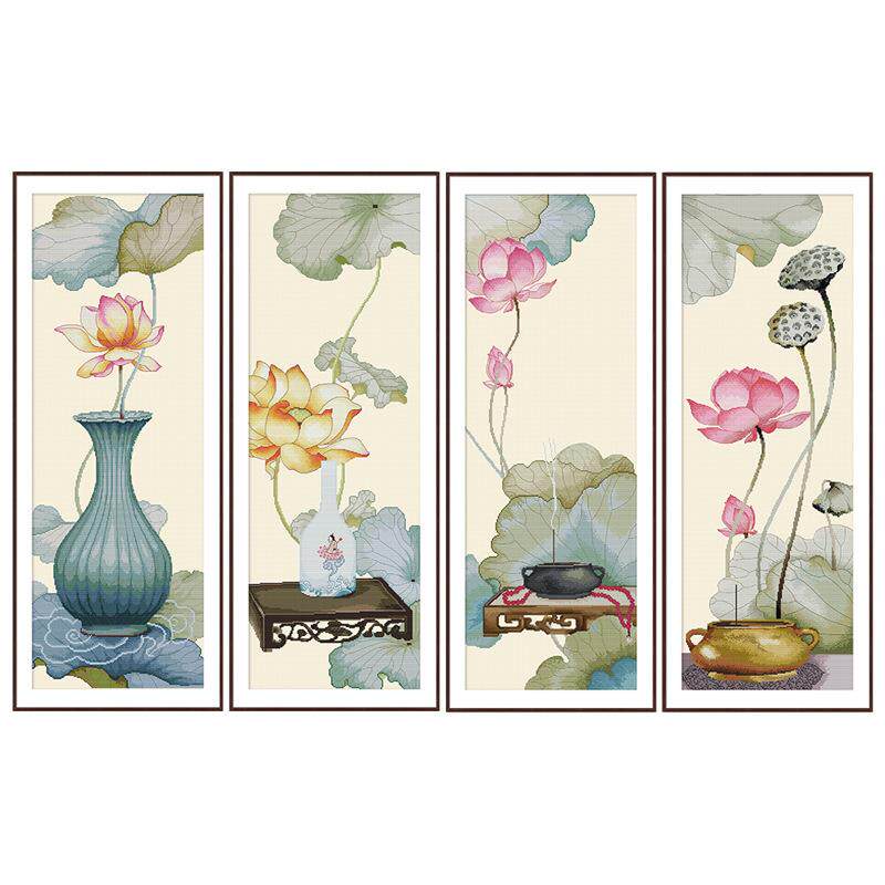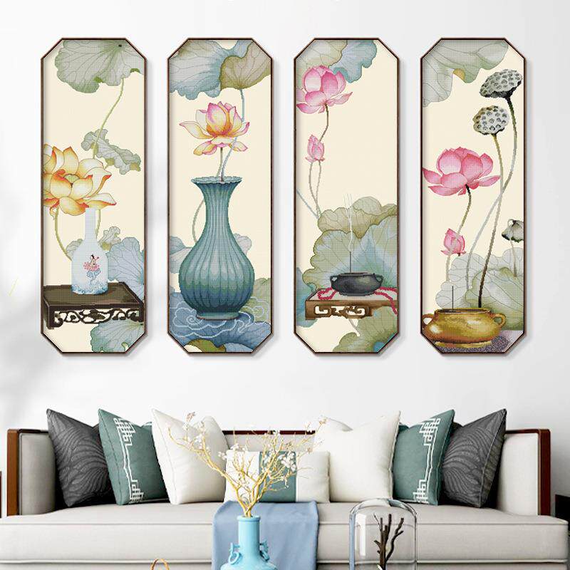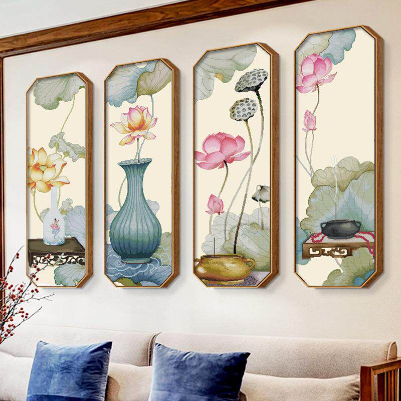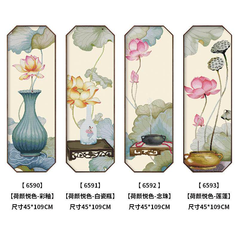 荷颜悦色十字绣四联竖版小幅自己绣手工客厅简约现代线绣新款