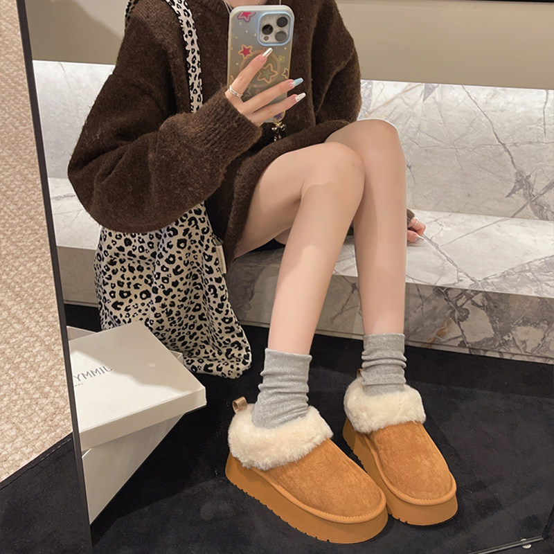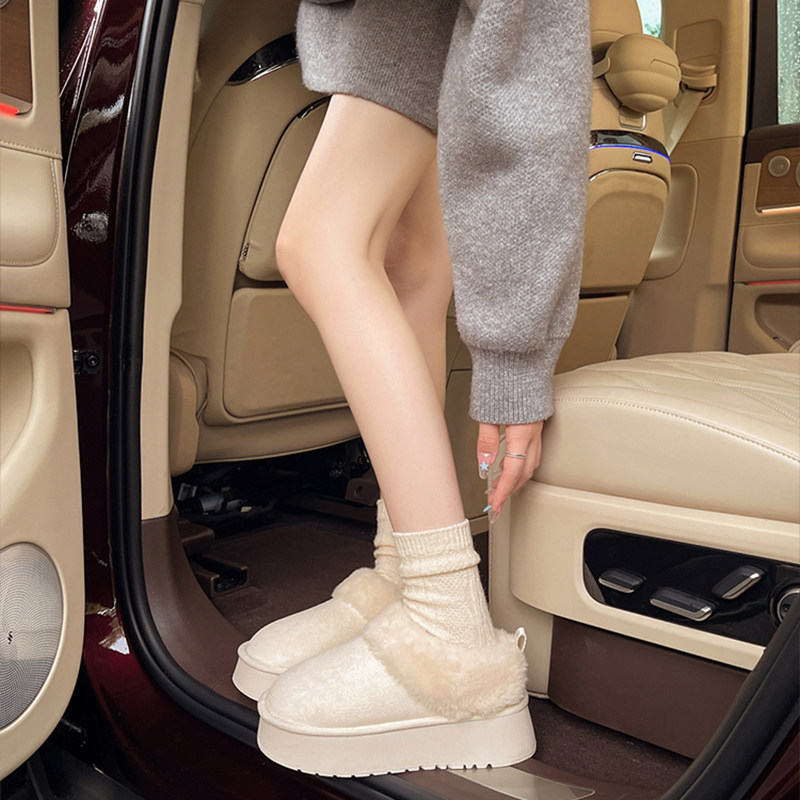 miu家厚底雪地靴女冬季真皮短靴羊毛侧拉链增高厚底加绒毛毛棉鞋