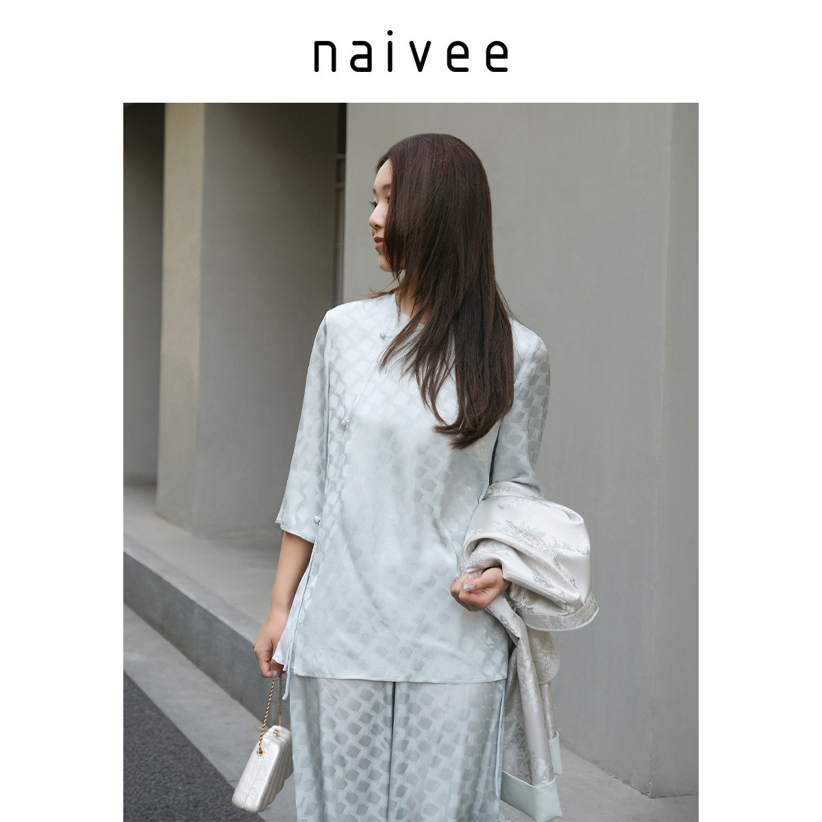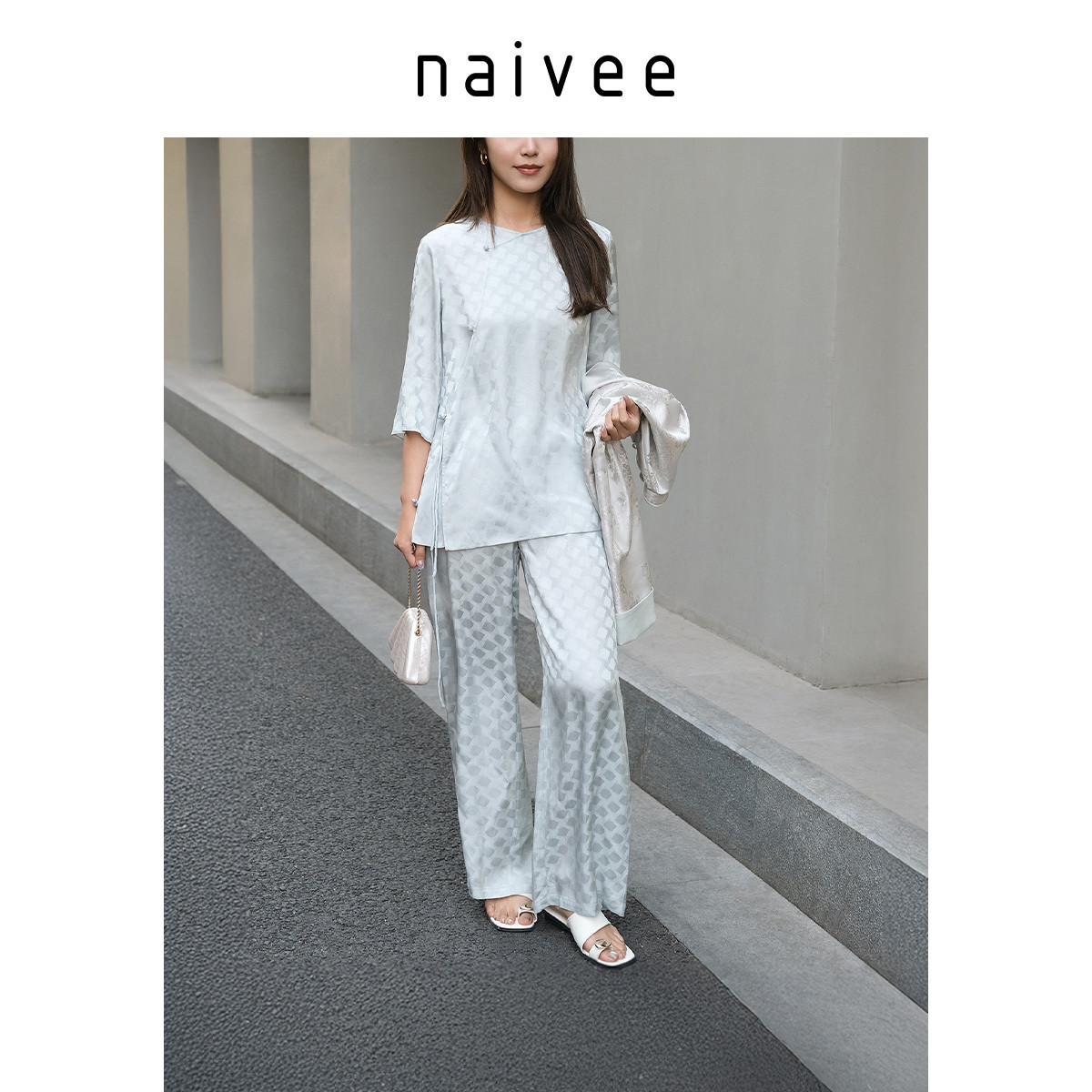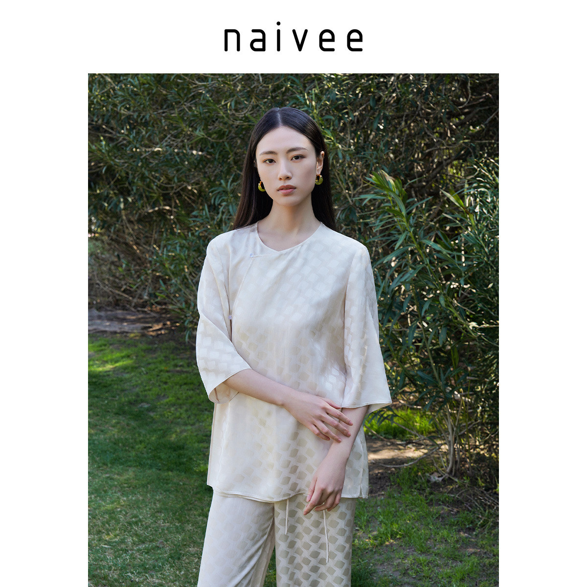 【醋酸格纹提花】naivee纳薇新中式套装轻凉透气中袖长裤春新款