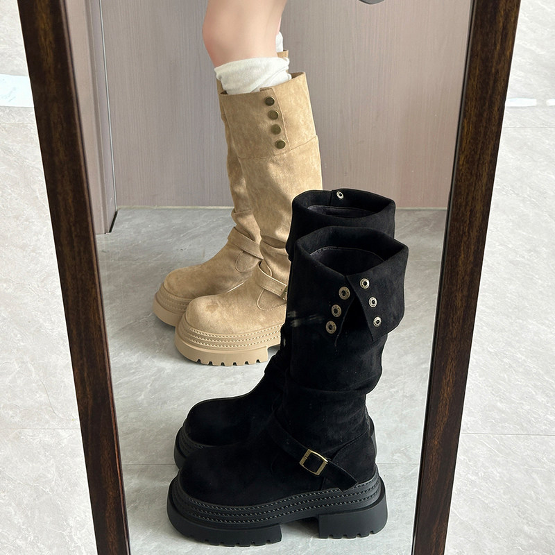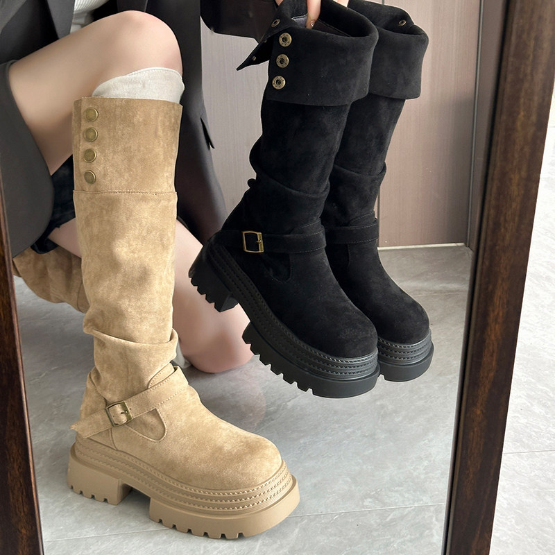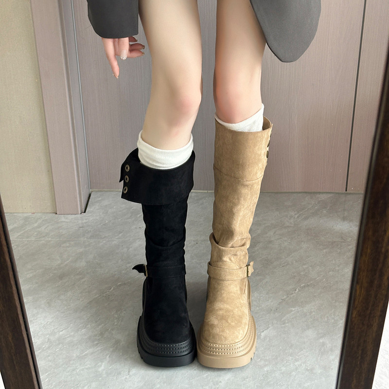 增高绒面长筒靴子女2025西部牛仔高筒骑士靴黑色圆头磨砂卡其色