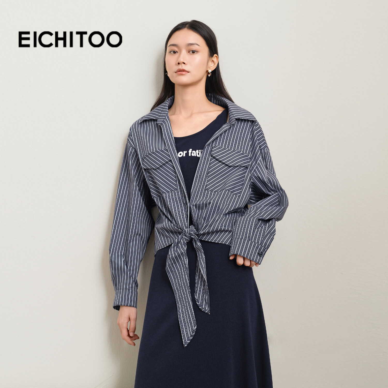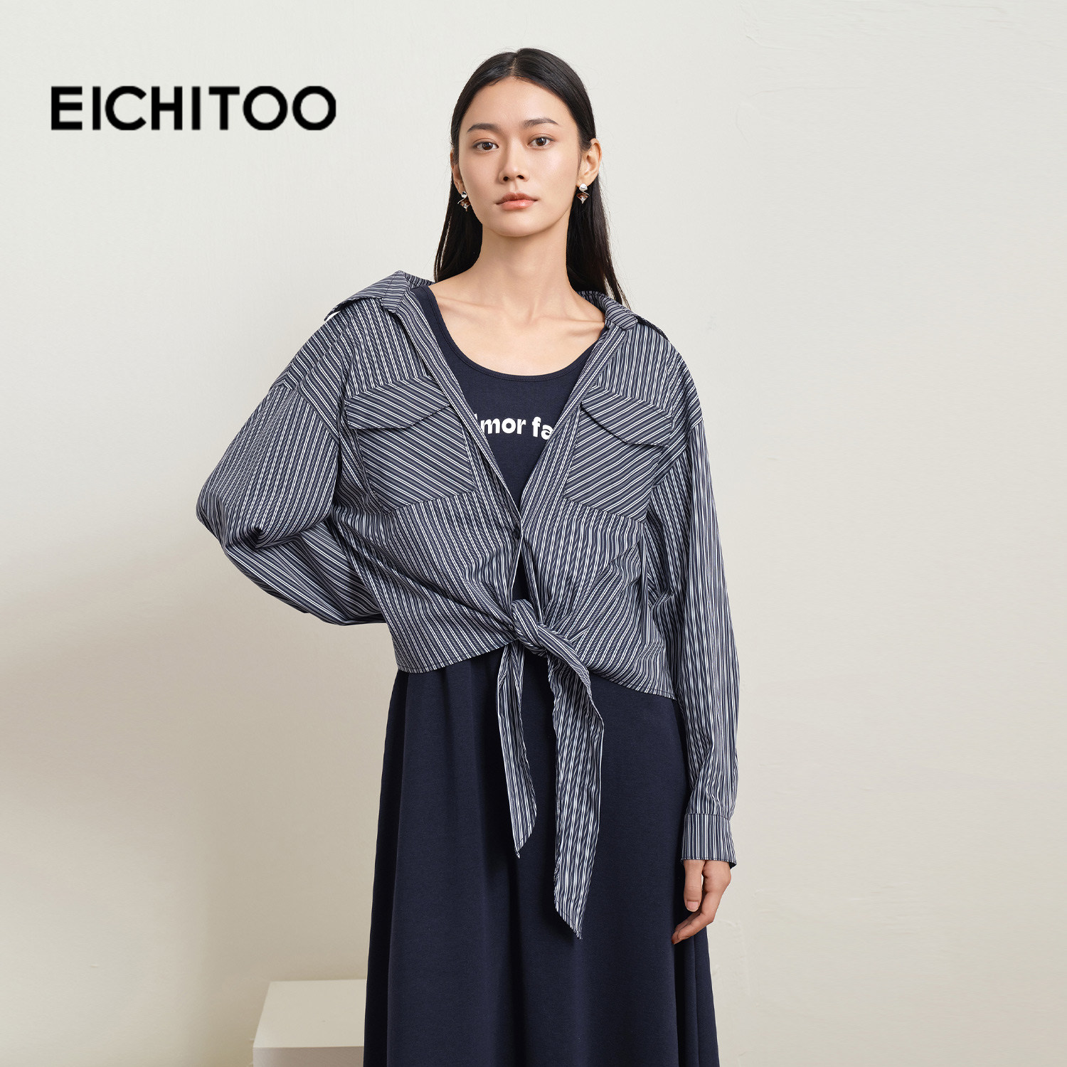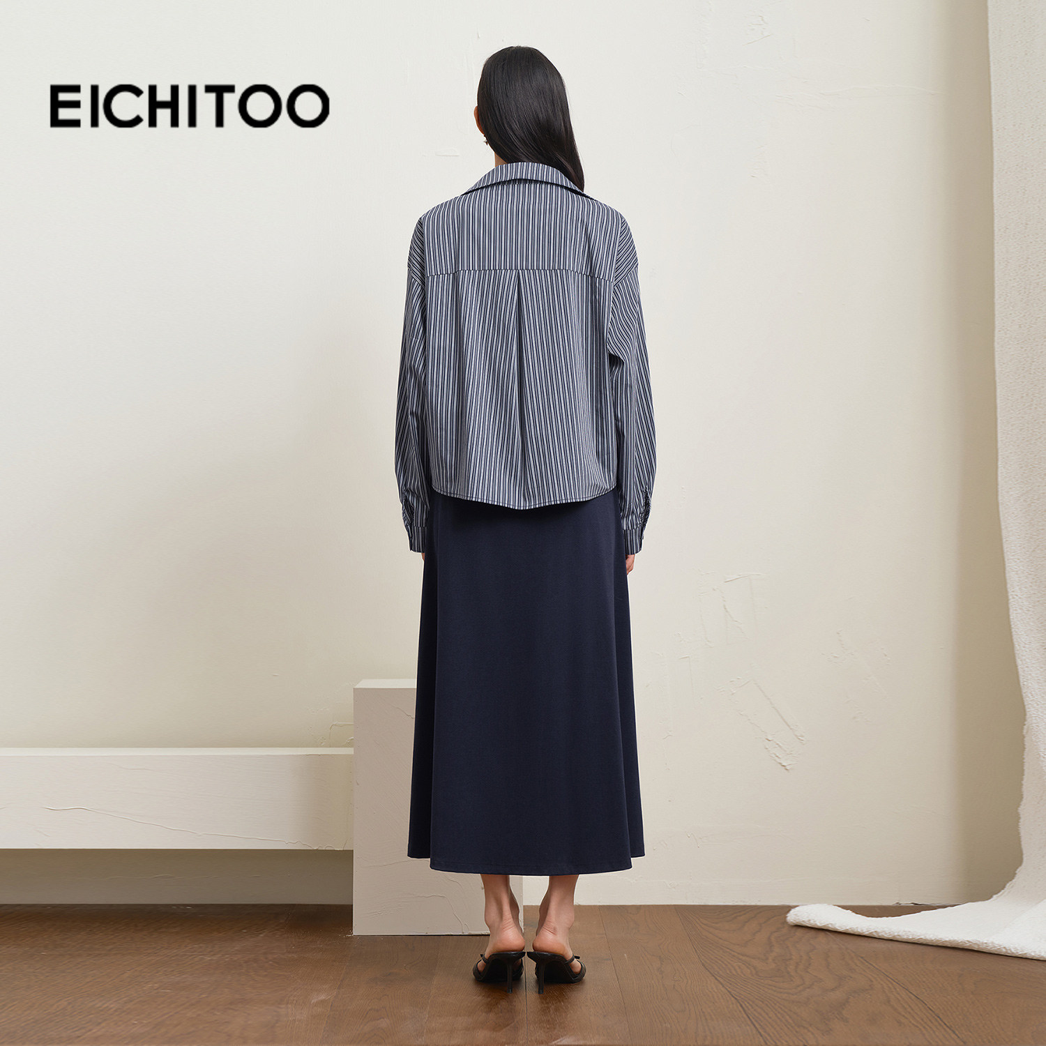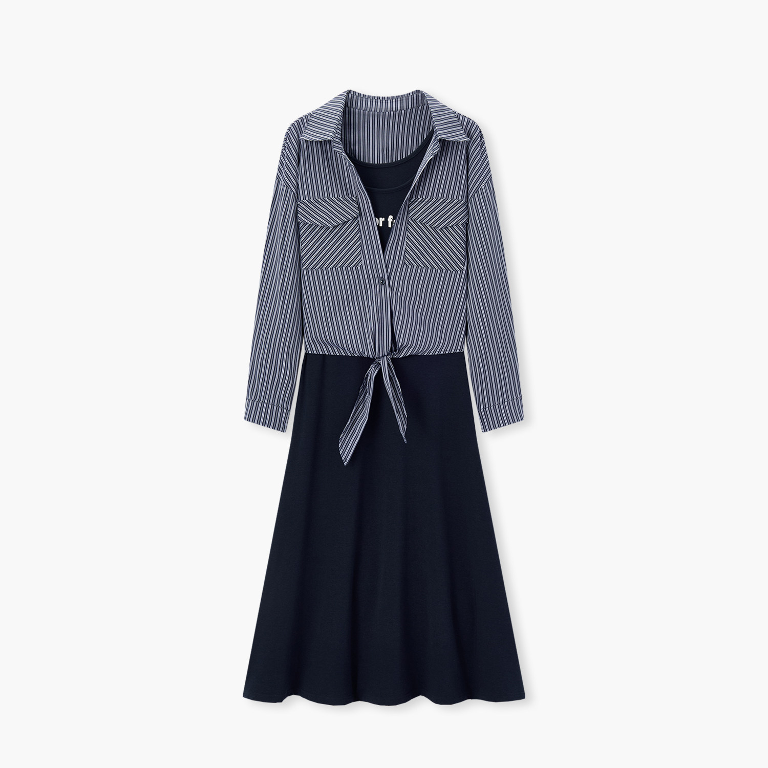 爱居兔藏青条纹衬衫背心连衣裙套装女2025年秋季新款显瘦简约长裙