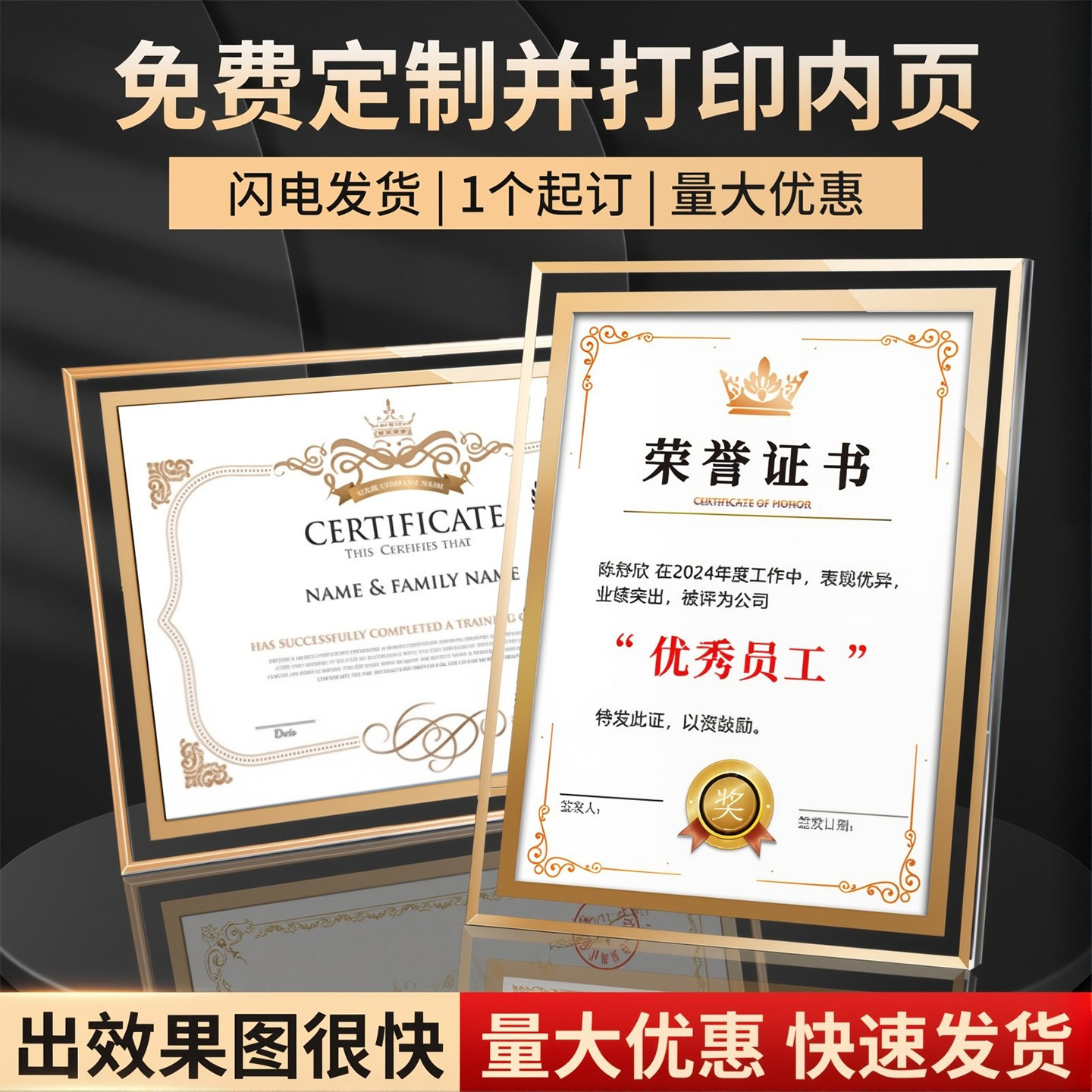 水晶荣誉证书本打印设计定制A4奖状内芯内页证件书获奖授权聘书外壳任命企业优秀员工毕业颁奖相框展示架奖牌