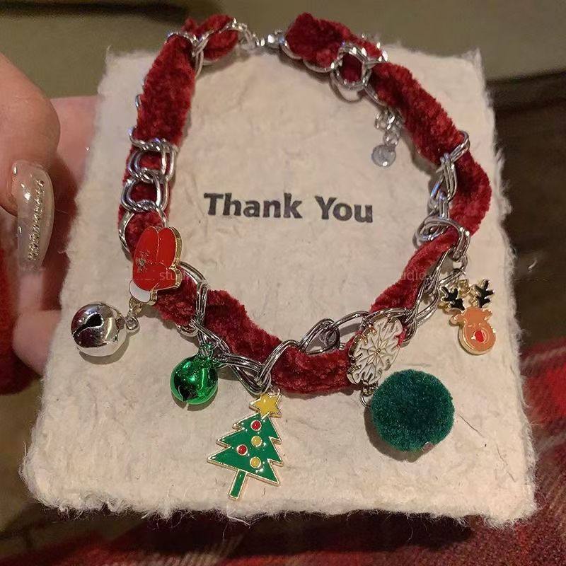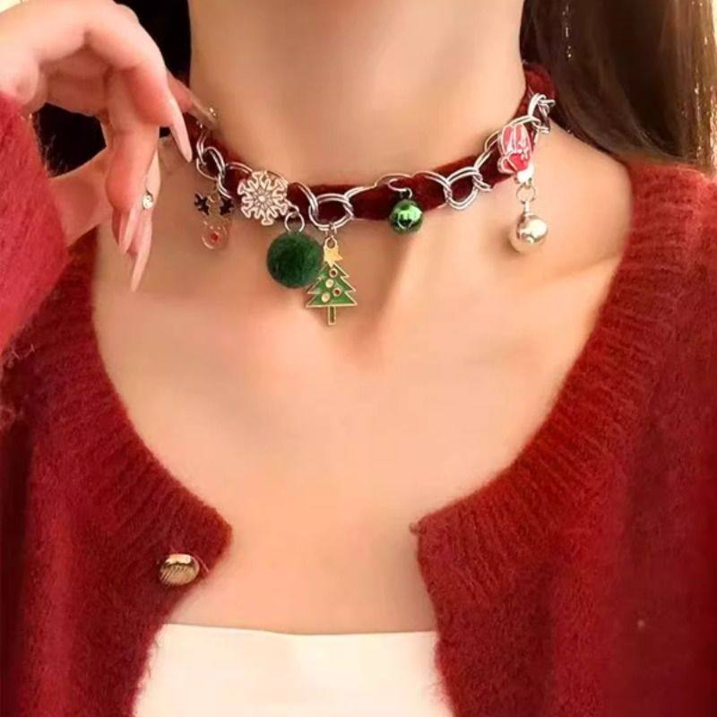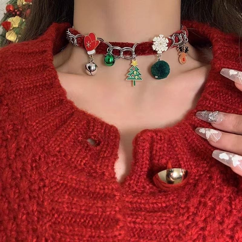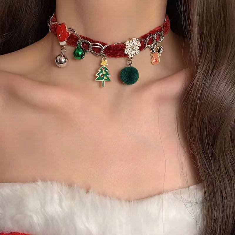 圣诞节红色毛绒项链~铃铛圣诞树麋鹿雪花choker项圈锁骨链颈链女