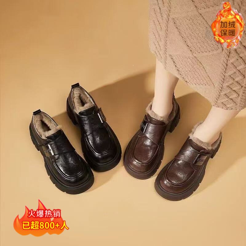 软皮防寒2025新款秋冬厚底乐福鞋女加绒保暖棉鞋冬季增高软底皮鞋