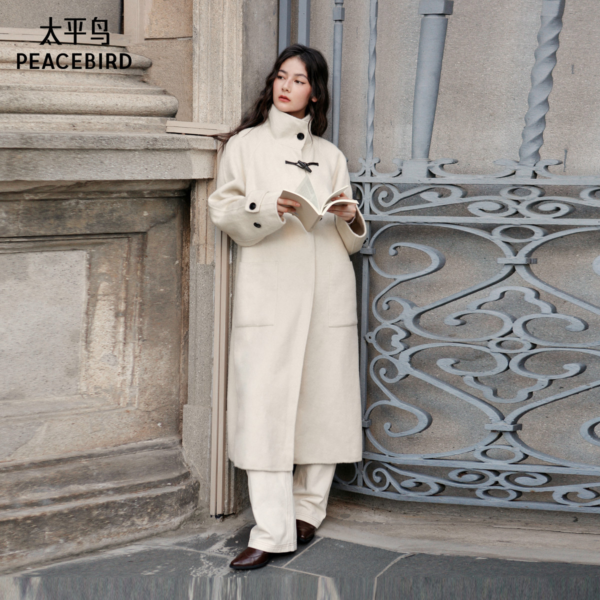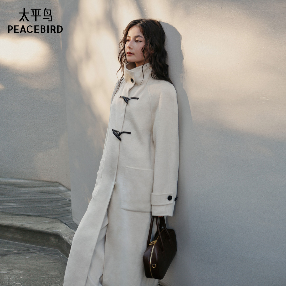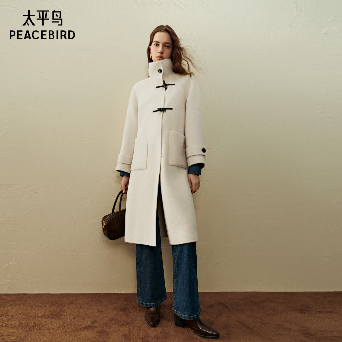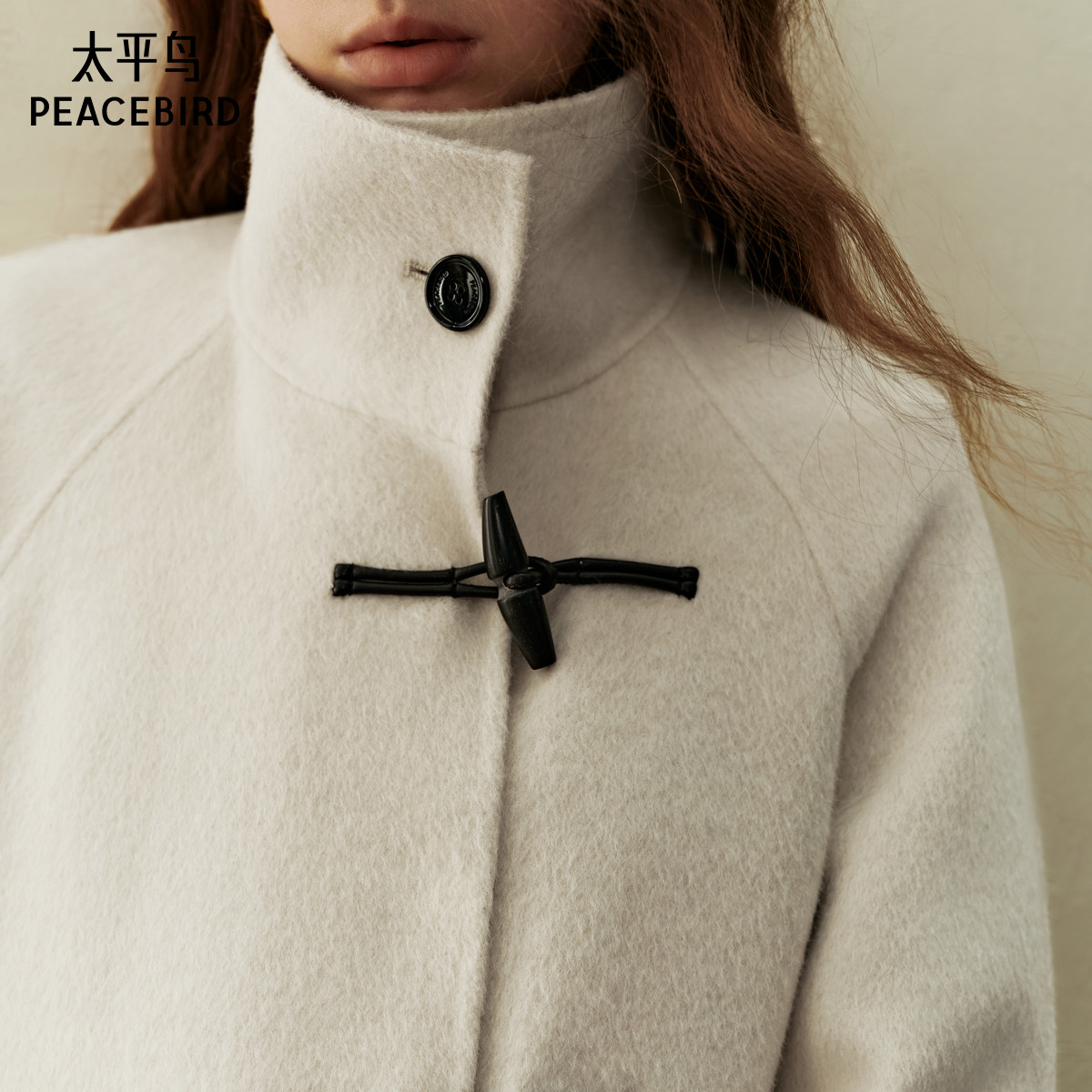 太平鸟大师甄绒系列款牛角扣双面呢大衣A1AAE4286