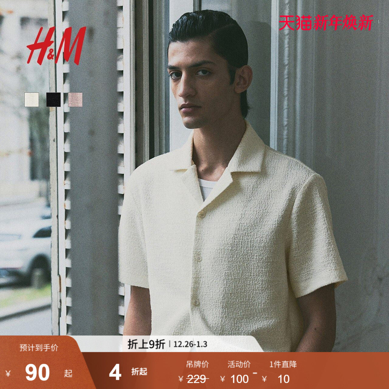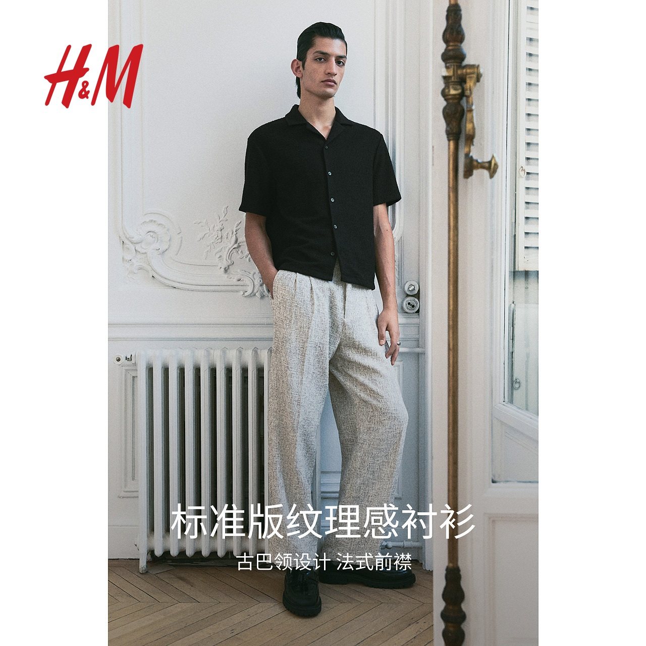HM男装古巴领衬衫2025冬新款通勤标准版型纹理感短袖上衣1265119