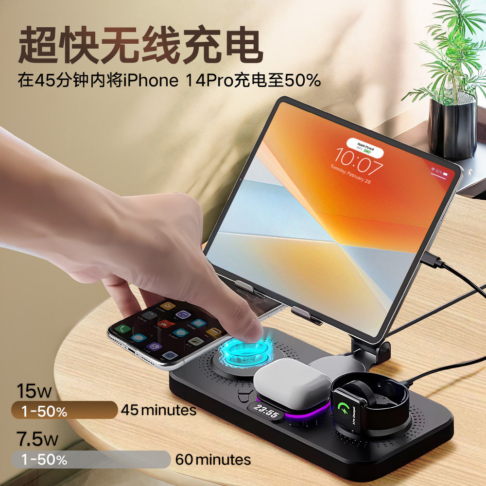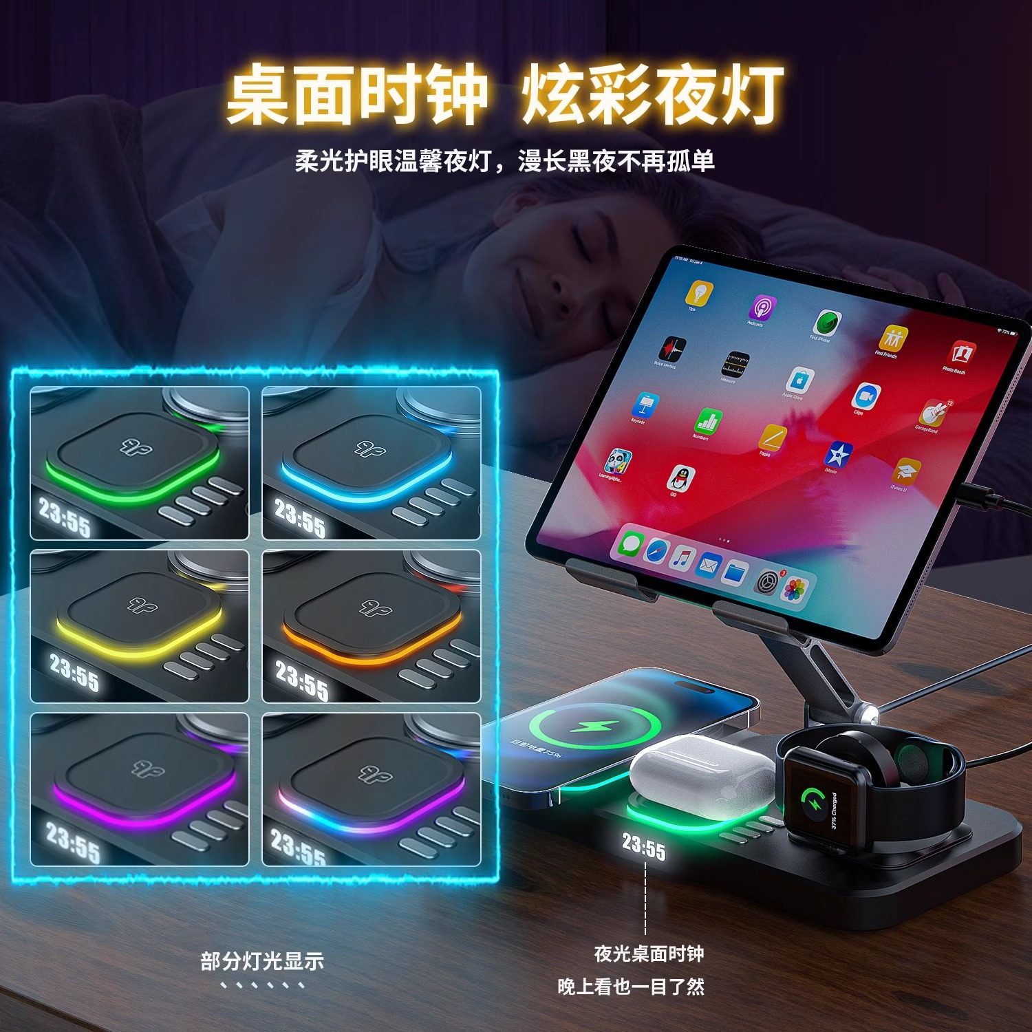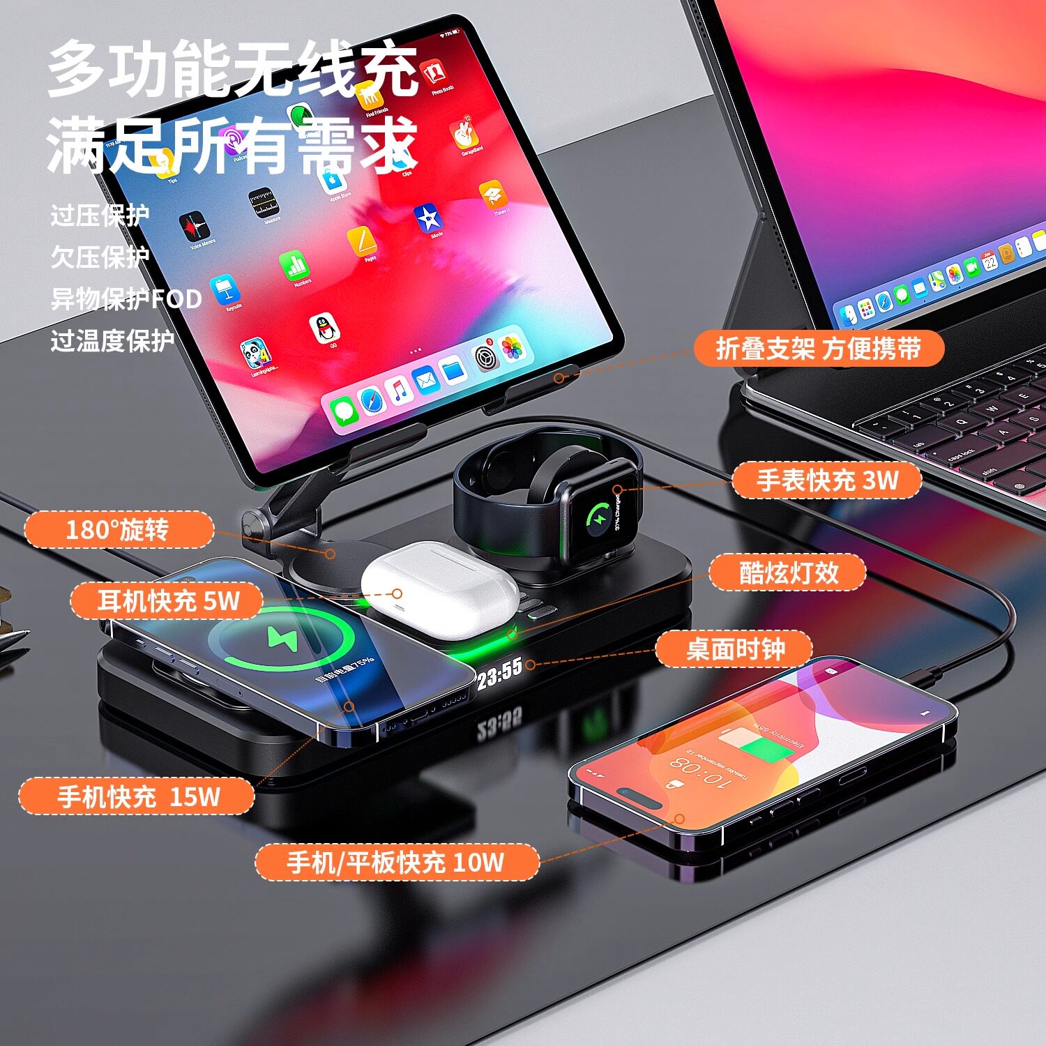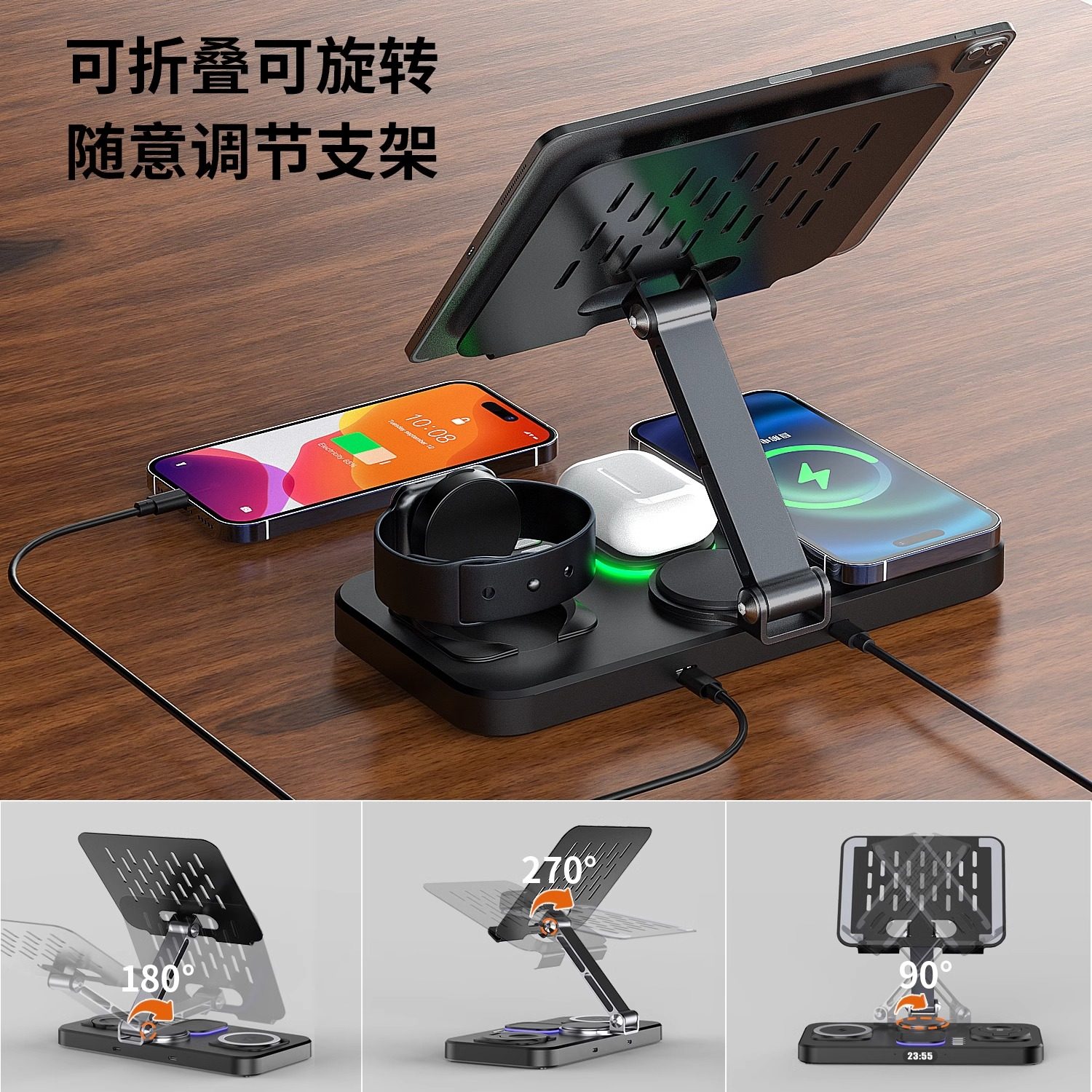妙酷iPad平板手机充电支架手表耳机磁吸三合一无线充电器pro可折叠旋转网课合金属桌面快充底座适用苹果华为