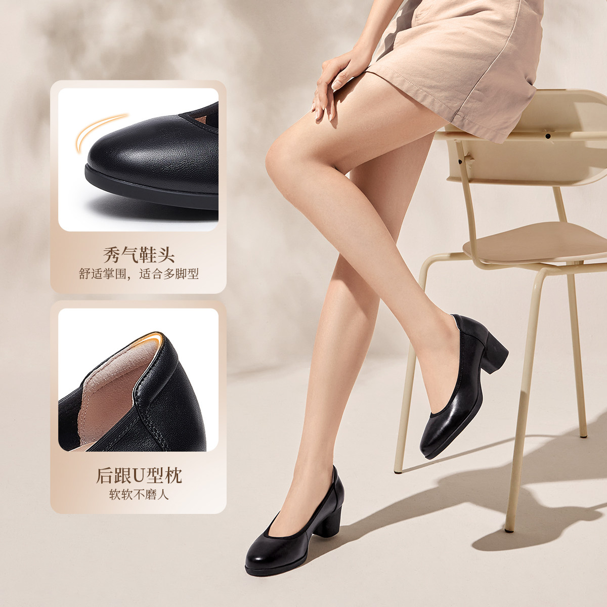 【明星同款|静音系列】千百度练习曲裸色高跟鞋真皮通勤法式单鞋